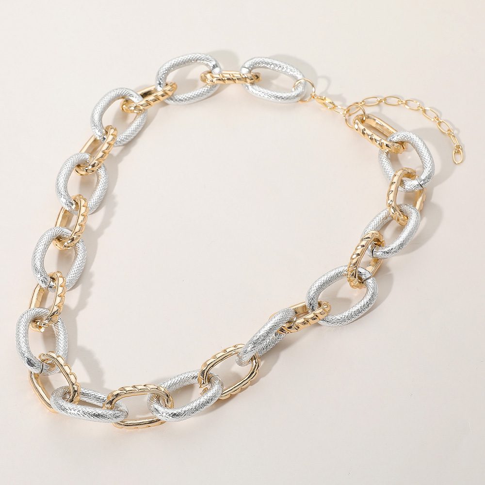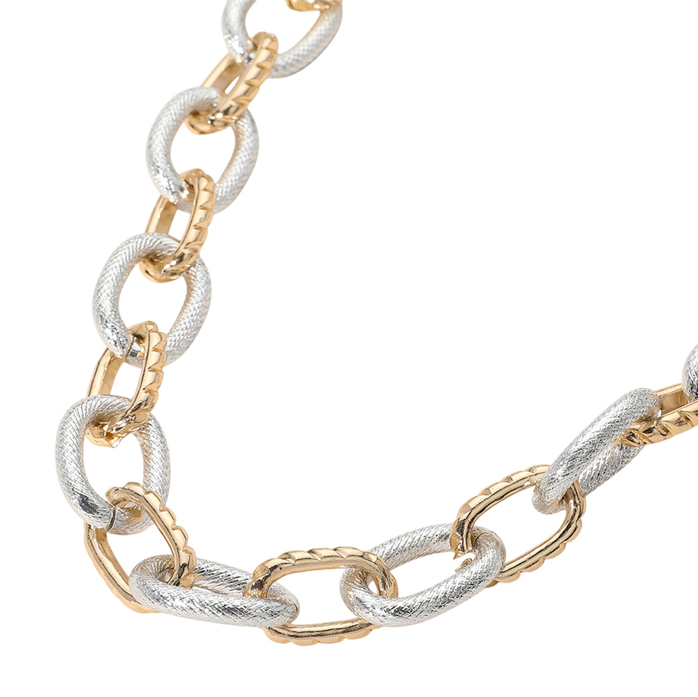 Details • Necklace Size : 19" + 3.25" L • Decor Size : 0.75" L • Bold mixed link chain necklace featuring a blend of textured and polished finishes. Designed with alternating oversized and twisted links for a stylish statement piece that enhances any outfit with modern flair. • Lead and Nickel Compliant
