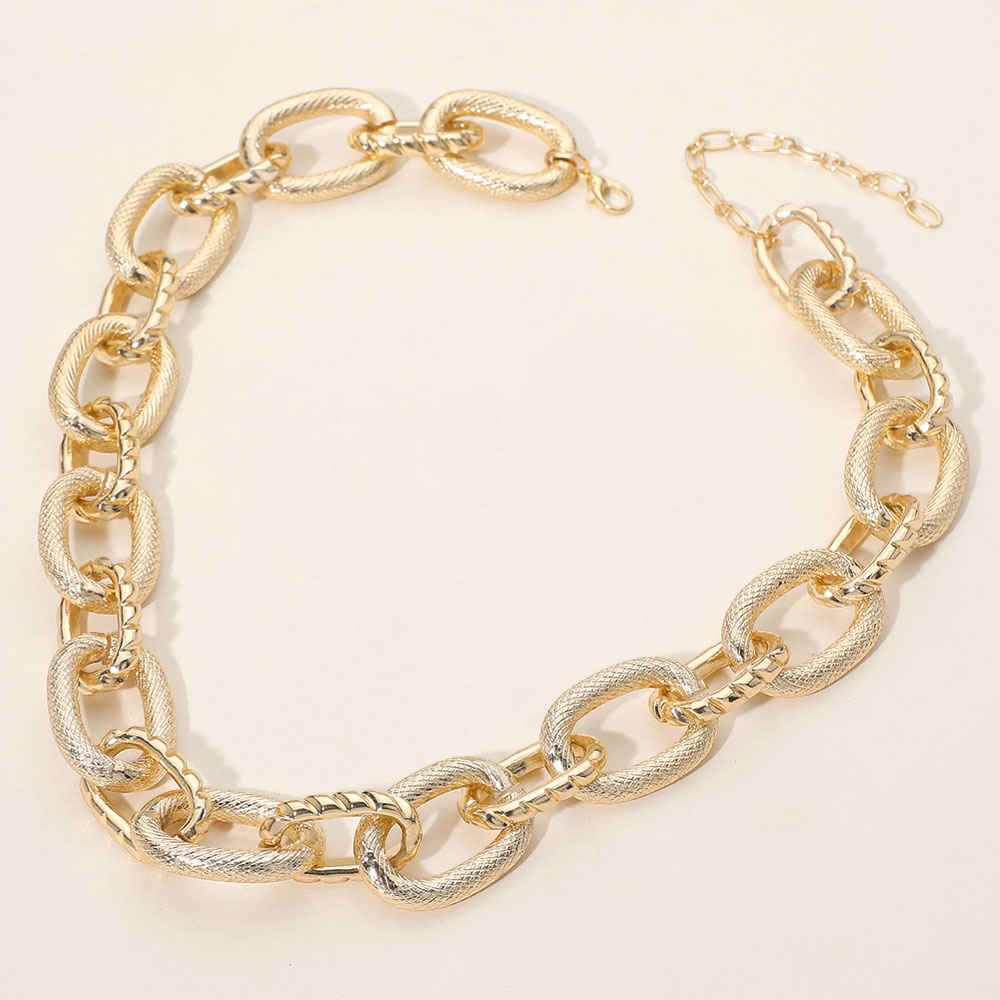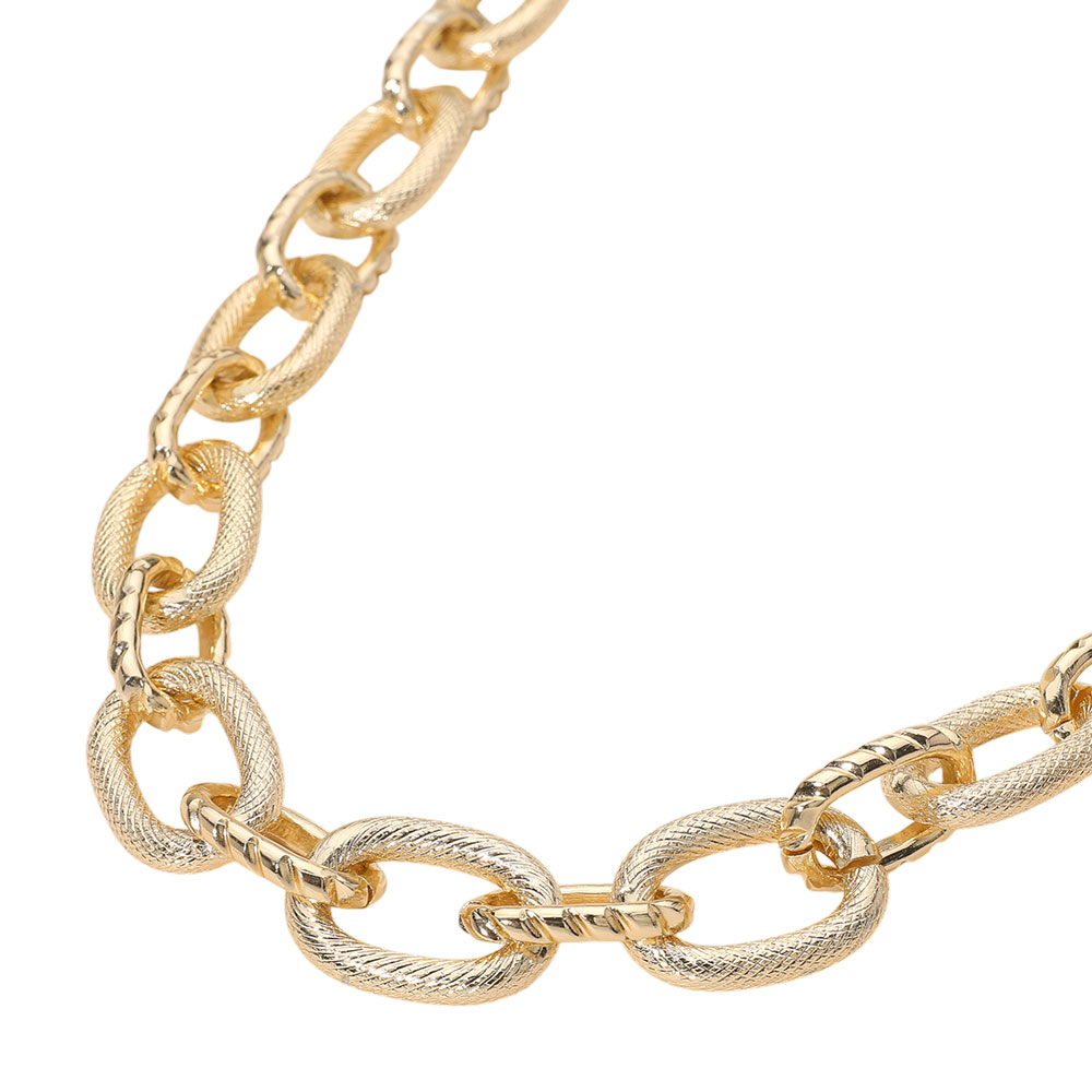 Details • Necklace Size : 19" + 3.25" L • Decor Size : 0.75" L • Bold mixed link chain necklace featuring a blend of textured and polished finishes. Designed with alternating oversized and twisted links for a stylish statement piece that enhances any outfit with modern flair. • Lead and Nickel Compliant