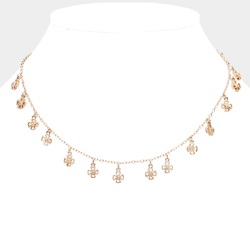 CZ Stone Embellished Cross Pendant Faceted Beaded Choker Necklace