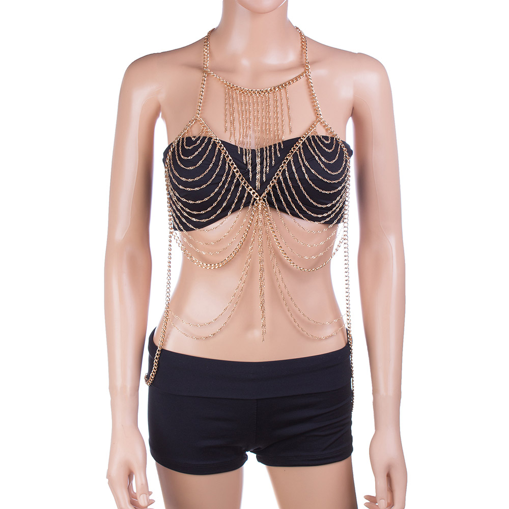 Draped bra shaped fringe bib body chain necklace