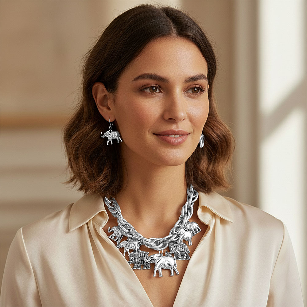 Details • Necklace Size : 18" + 3" L • Decor Size : 2" L • Earring Size: 1.5" L • Bold statement necklace featuring layered chain styling accented with detailed elephant charms and a coordinated drop earring pair. Designed to create visual impact, this playful yet elegant set adds character and charm to everyday outfits, themed looks, and special occasions with an eye-catching silhouette. • Lead and Nickel Compliant