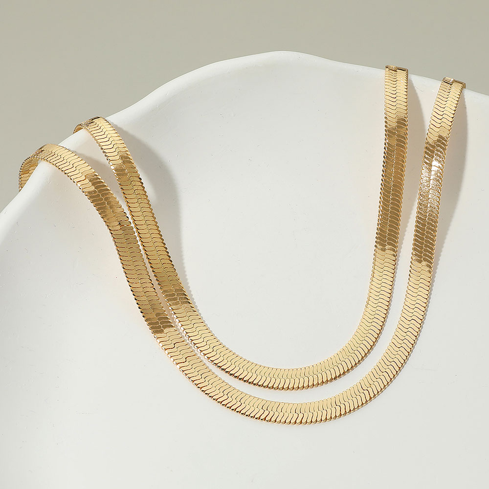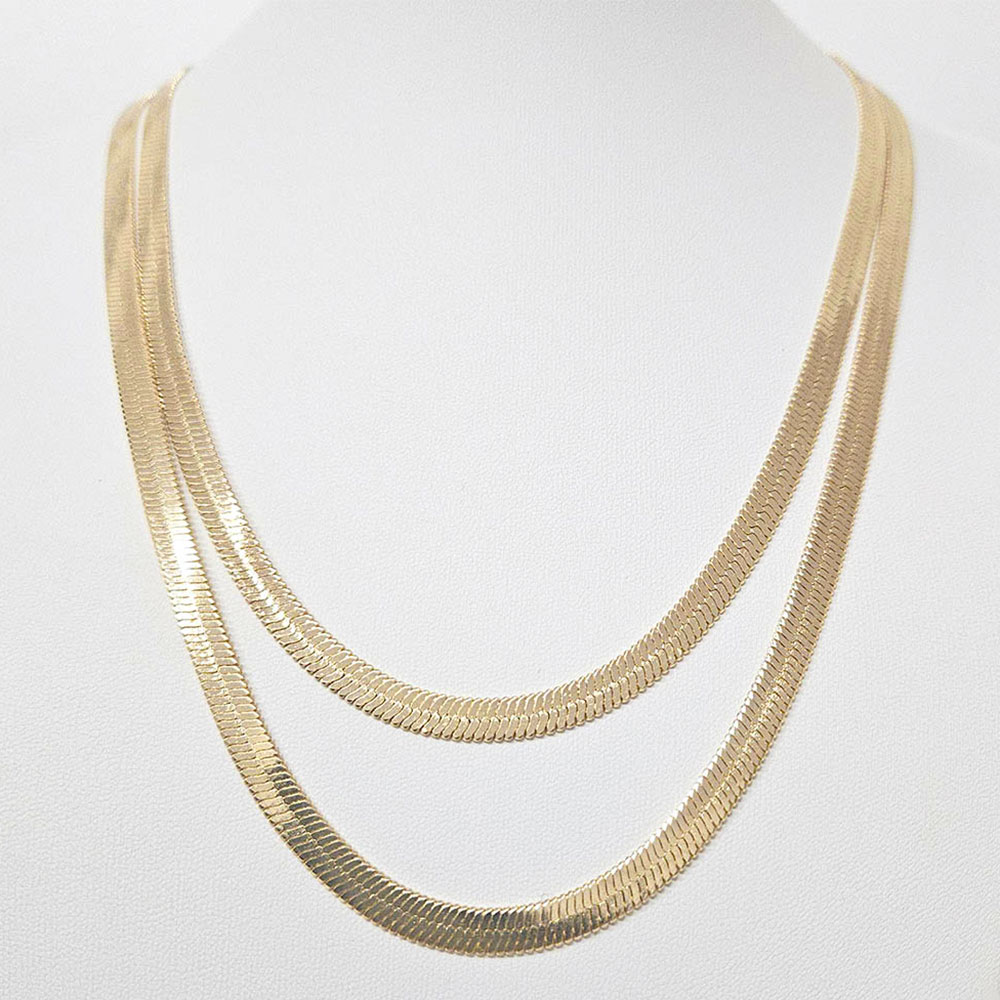 • Elevate your jewelry collection with this double layer herringbone chain necklace, designed for a sleek and bold statement. Featuring flat, reflective links with a fluid finish, this versatile piece is perfect for layering or wearing alone for timeless, modern elegance.