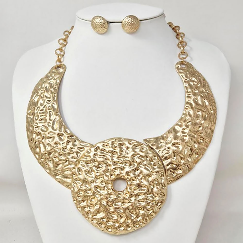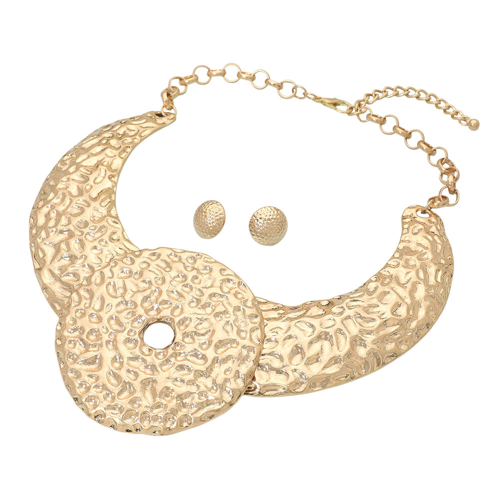 • Elevate your look with this hammered statement collar necklace and matching earrings. Featuring bold, sculpted textures and a striking circular centerpiece, this set exudes modern elegance—perfect for adding a touch of artistic sophistication to any outfit.