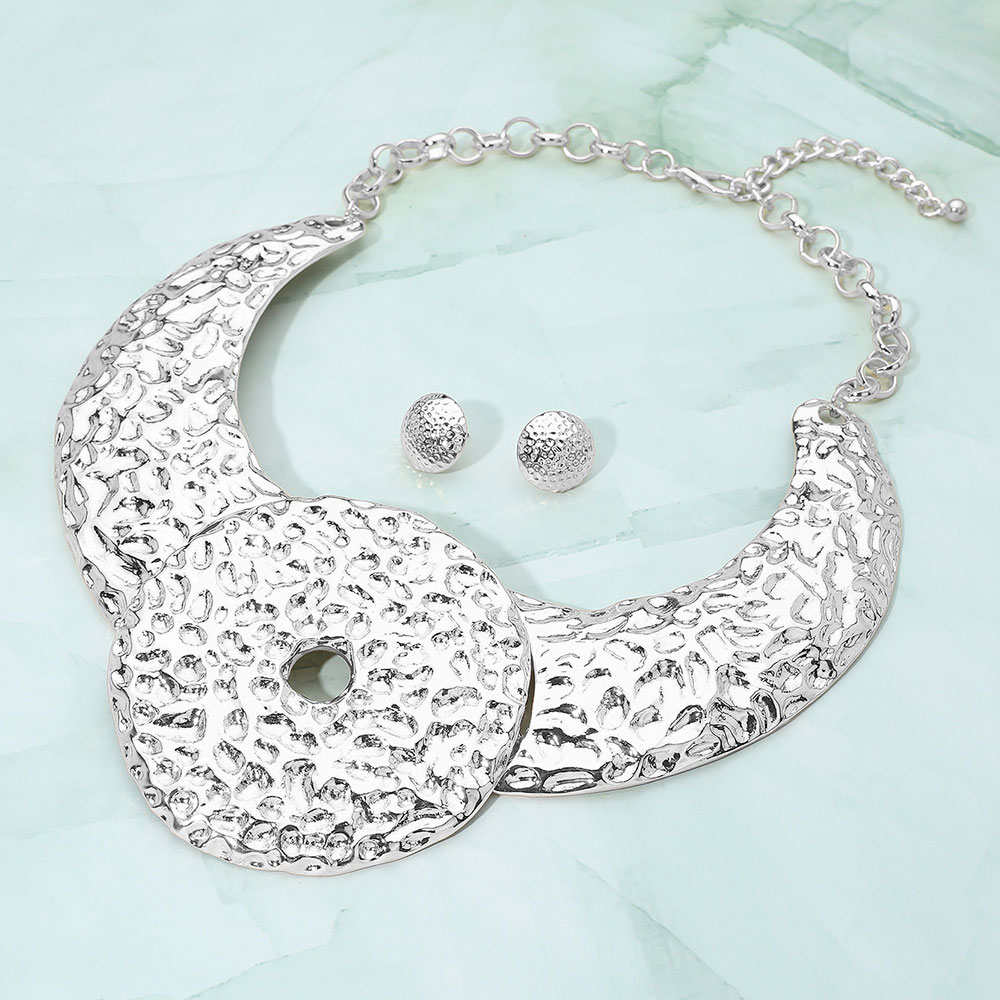 Details • Necklace Size : 19" + 3" L • Decor Size : 3.5" L • Earrings Size : 0.7" L • Elevate your look with this hammered statement collar necklace and matching earrings. Featuring bold, sculpted textures and a striking circular centerpiece, this set exudes modern elegance—perfect for adding a touch of artistic sophistication to any outfit. • Lead and Nickel Compliant