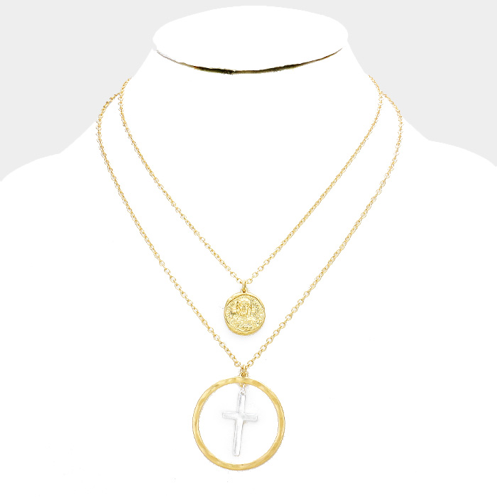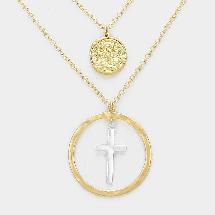 Double Layered Metal Cross Jesus Disc Drop Chain Tassel Necklace