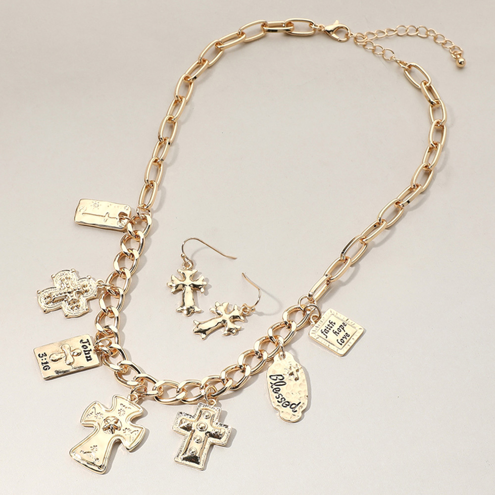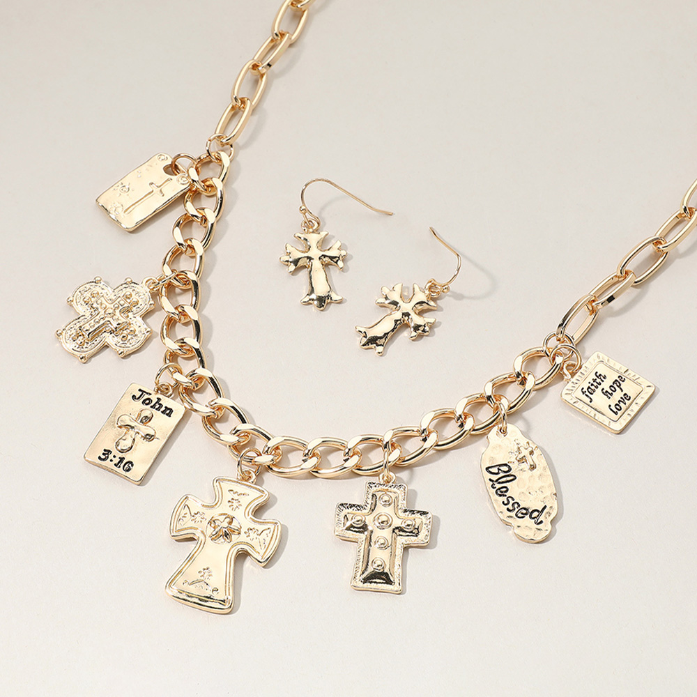 Metal Cross Bible Charm Station Chunky Chain Necklace