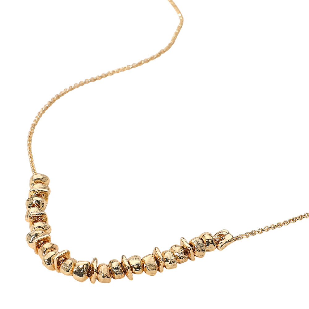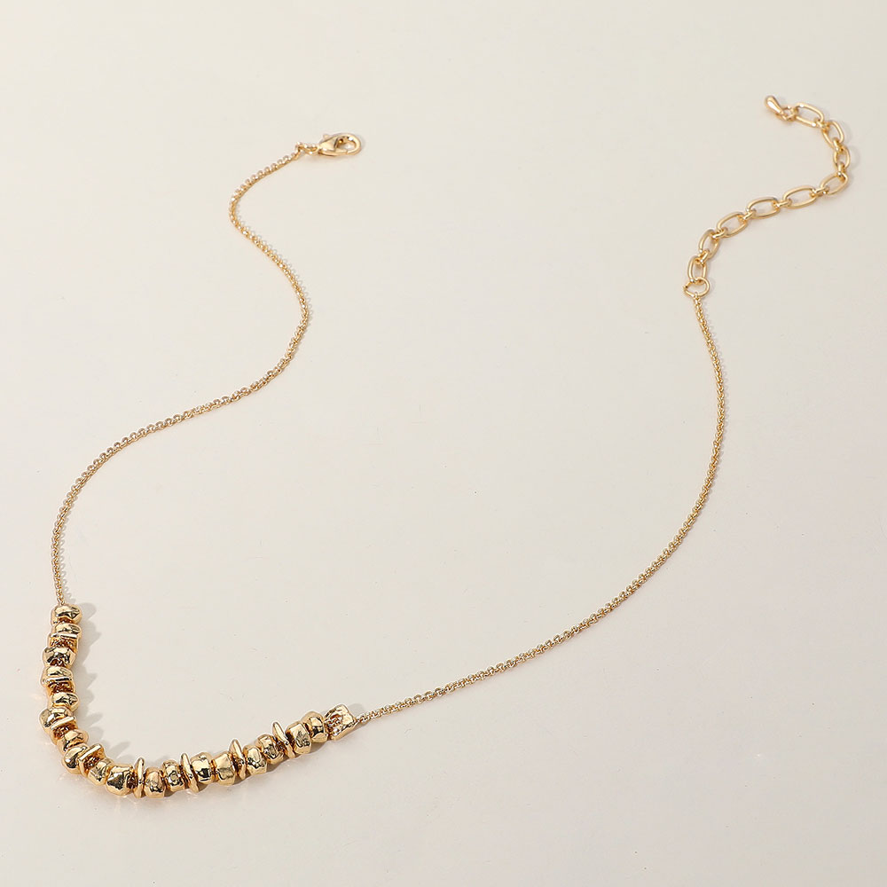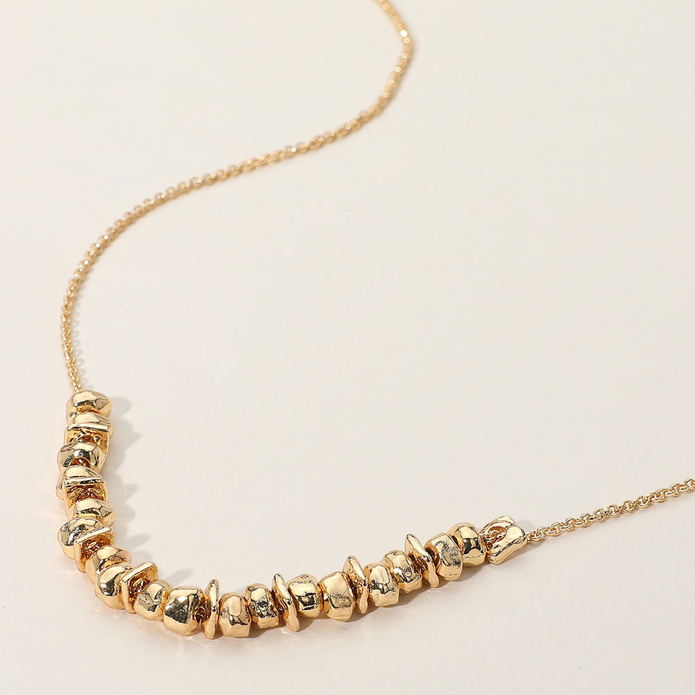 Details • Necklace Size : 16" + 3.5" L • Decor Size : 0.25" L • Elevate your style with this chunky nugget bar pendant necklace. Featuring a row of irregular metallic nuggets on a delicate chain, it blends modern design with artistic texture for a bold yet refined look. • Lead and Nickel Compliant
