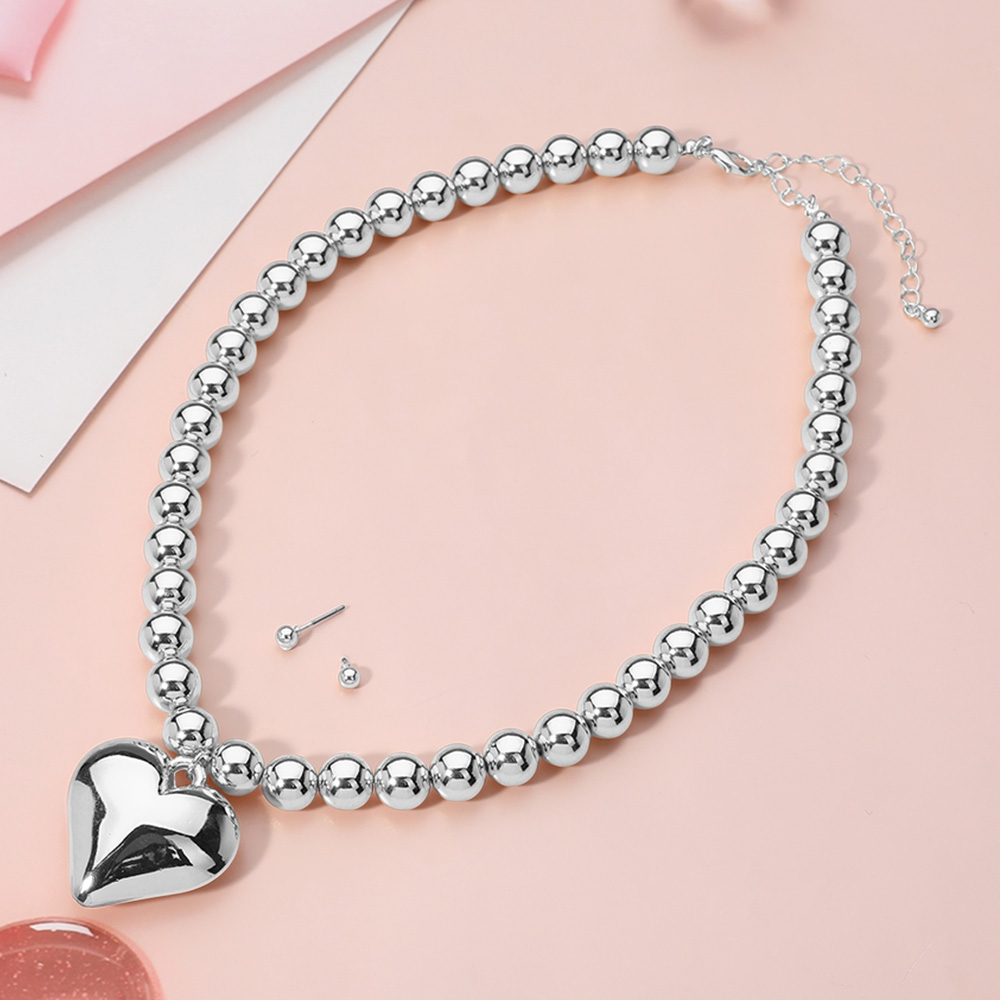 Metal Puffy Heart Pendant Ball Beaded Necklace
