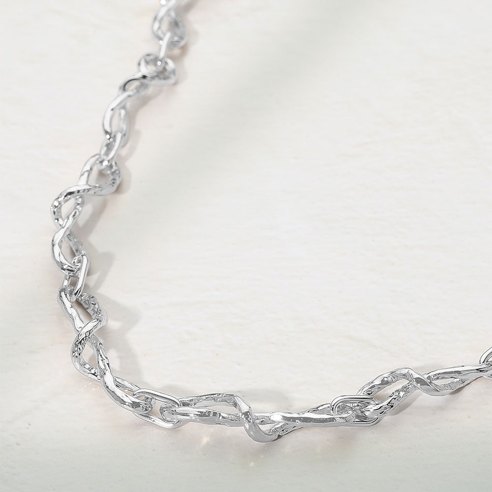 Details • Necklace Size : 15.5" + 3" L • Decor Size : 0.4" L • Add modern edge to your look with this twisted irregular chain necklace featuring unique textured links and a polished finish. Designed with an adjustable closure for a custom fit, this versatile piece is perfect for layering or wearing solo, making it an ideal statement for everyday style. • Lead and Nickel Compliant