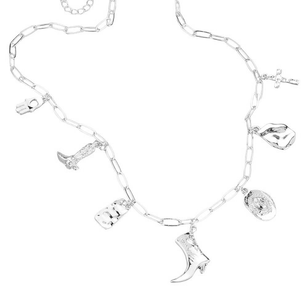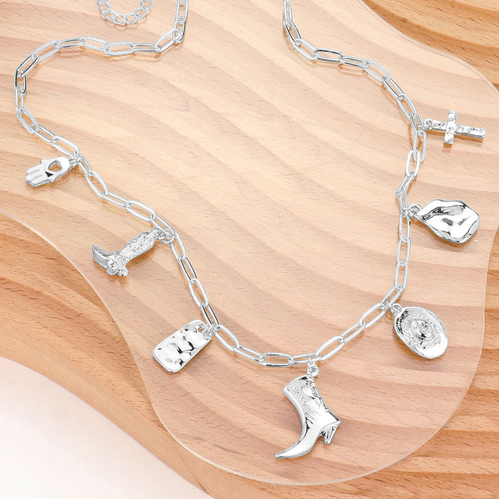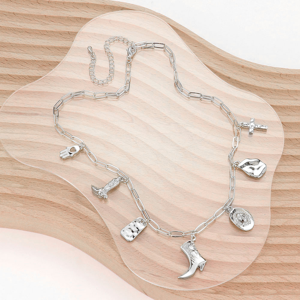 Metal Western Boot Charm Hamsa Hand Cross Charm Station Paperclip Chain Necklace