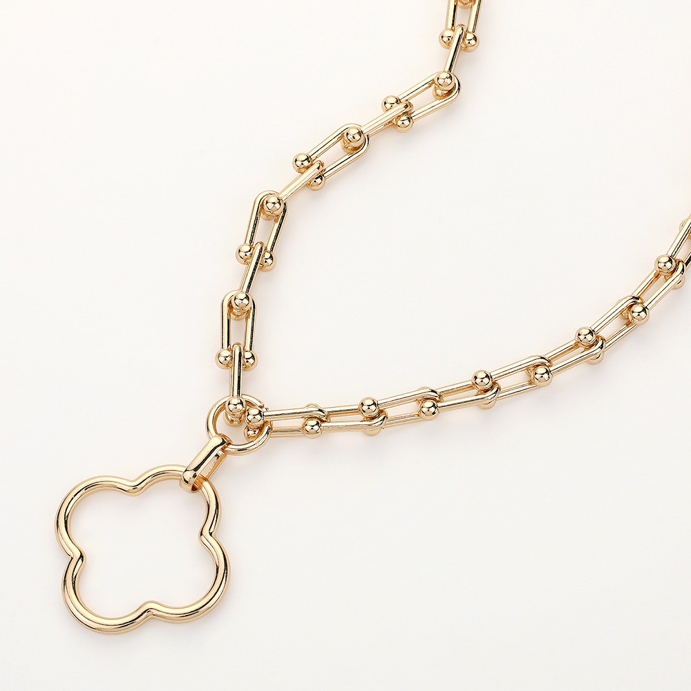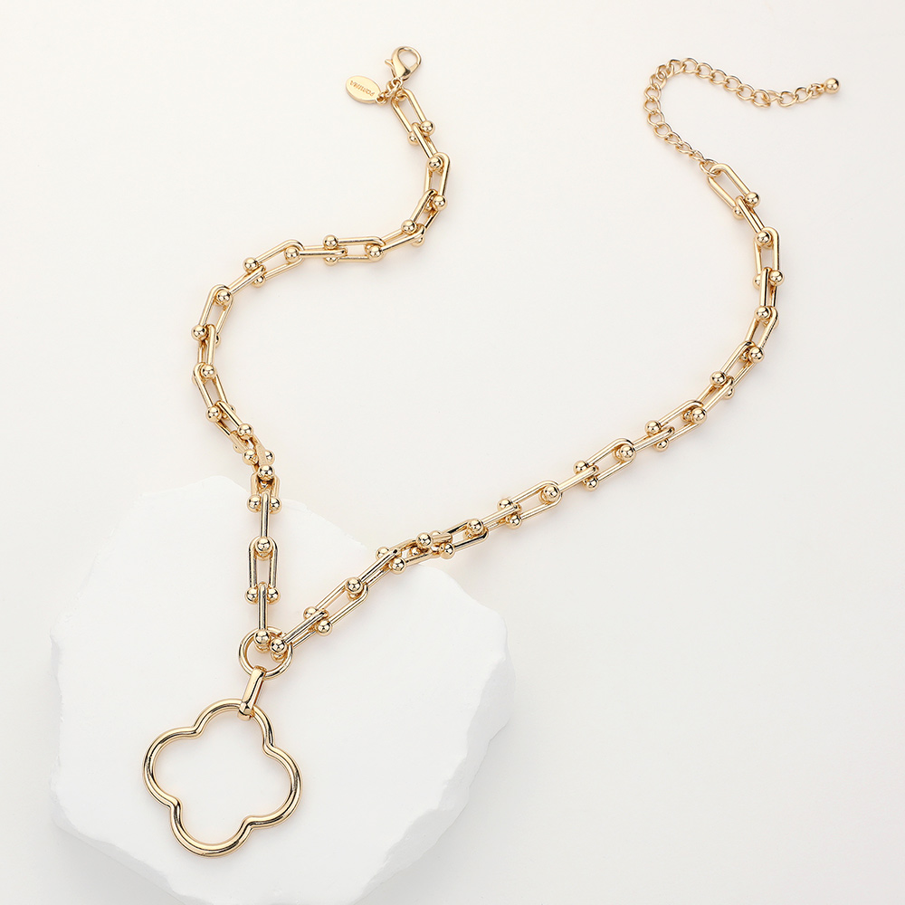 Details • Necklace Size : 16.5" + 3" L • Decor Size : 0.25" L • Pendant Size : 1.3" X 2" • Stylish chain necklace featuring a geometric clover pendant and modern linked chain design. A versatile statement piece perfect for layering or wearing alone, this chic necklace adds elegance and charm to everyday outfits, workwear, or special occasions with ease. • Lead and Nickel Compliant