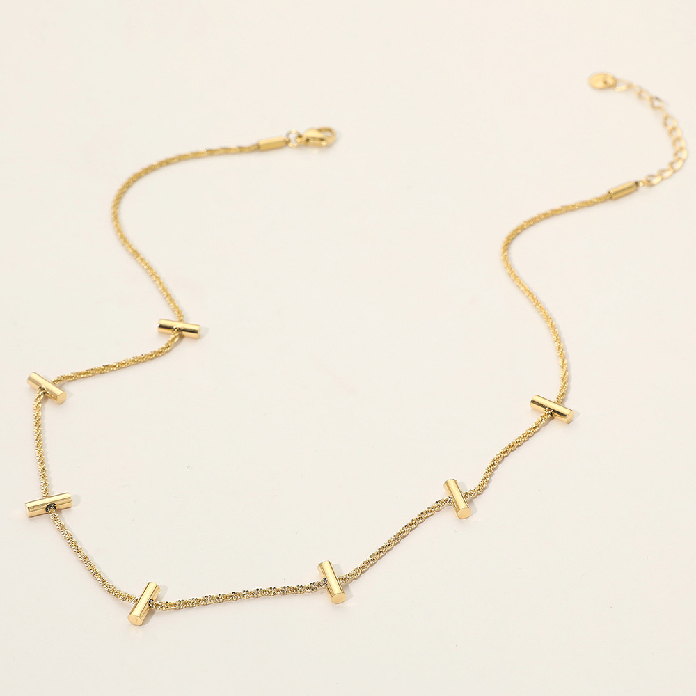 Details • Necklace Size : 16" + 2" L • Decor Size : 0.4" L • Water Resistant • Add subtle sophistication to your look with this modern tube bar necklace, featuring a sleek arrangement of small cylindrical accents on a refined chain. Perfect for both everyday wear and elegant occasions, this versatile piece complements any minimalist jewelry collection. • Hypoallergenic • Stainless Steel