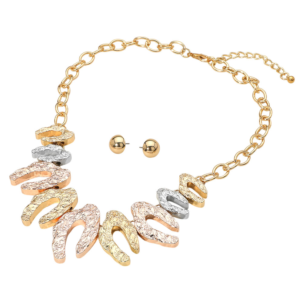 Details • Necklace Size : 24" + 3.25" L • Decor Size : 2" L • Earrings Size : 0.6" L • Bold abstract necklace with wavy textured design and matching stud earrings. Perfect accessory to elevate evening wear or add flair to your everyday look. • Lead and Nickel Compliant