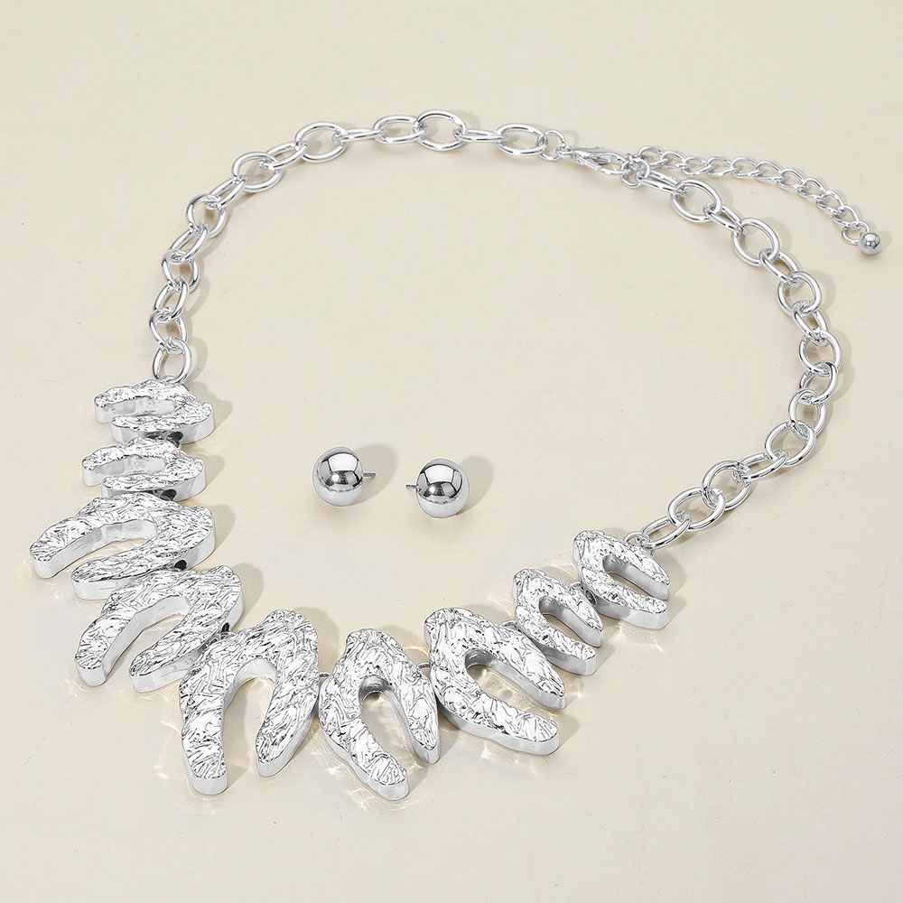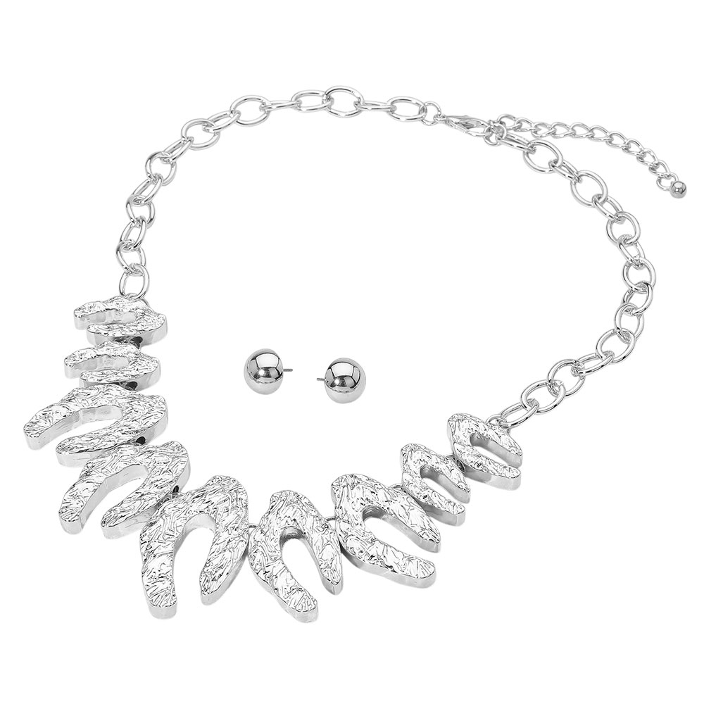 Details • Necklace Size : 24" + 3.25" L • Decor Size : 2" L • Earrings Size : 0.6" L • Bold abstract necklace with wavy textured design and matching stud earrings. Perfect accessory to elevate evening wear or add flair to your everyday look. • Lead and Nickel Compliant