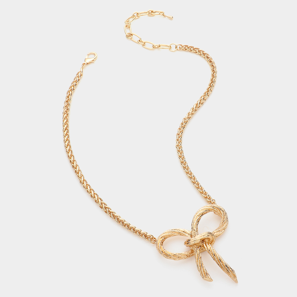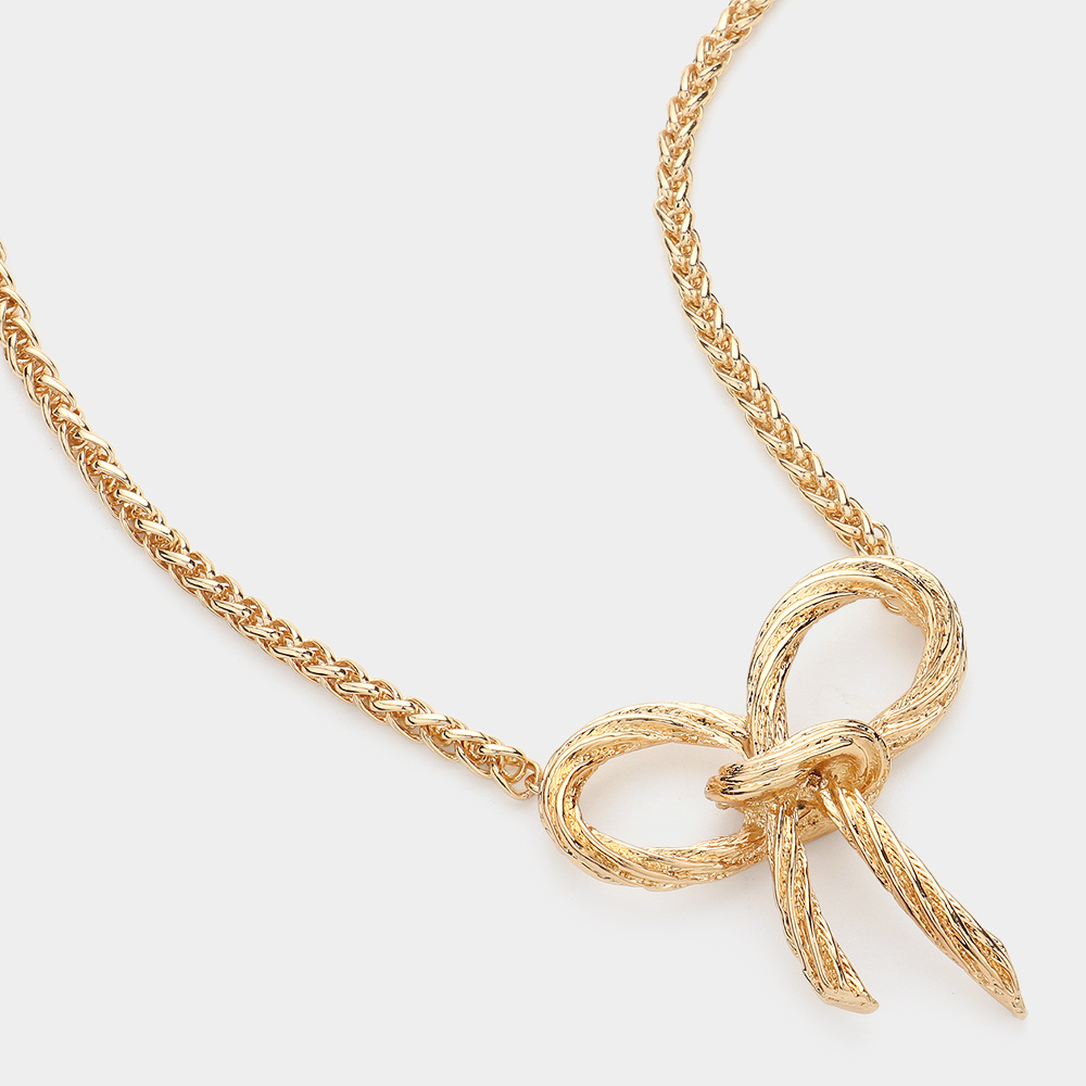 Textured Brass Metal Bow Pendant Pointed Necklace