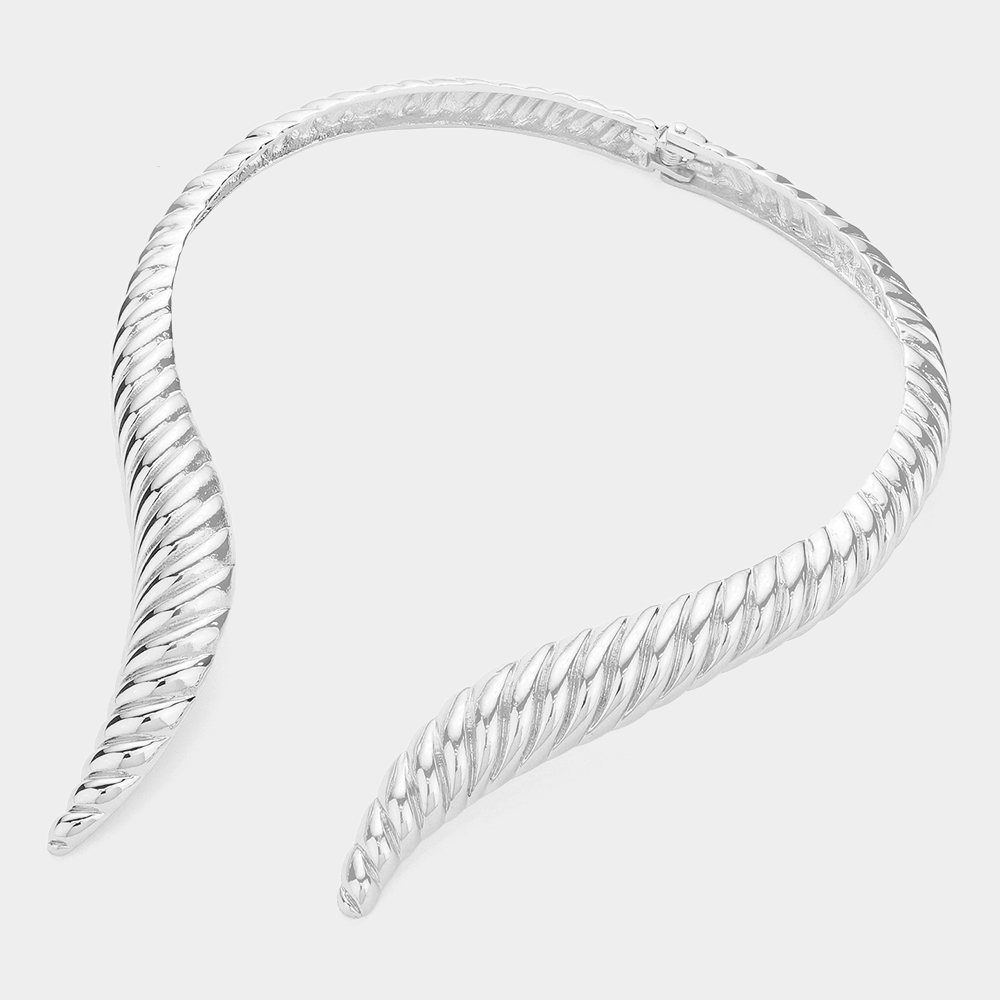 Details • Size : 5.4" D • Decor Size : 2.25" L • Hinged Closure • Bold open collar necklace with a twisted torque design, crafted to create a powerful statement look. Perfect for elevating eveningwear or adding drama to minimalist outfits, this sculptural piece exudes confidence and modern elegance in a striking silhouette. • Lead and Nickel Compliant
