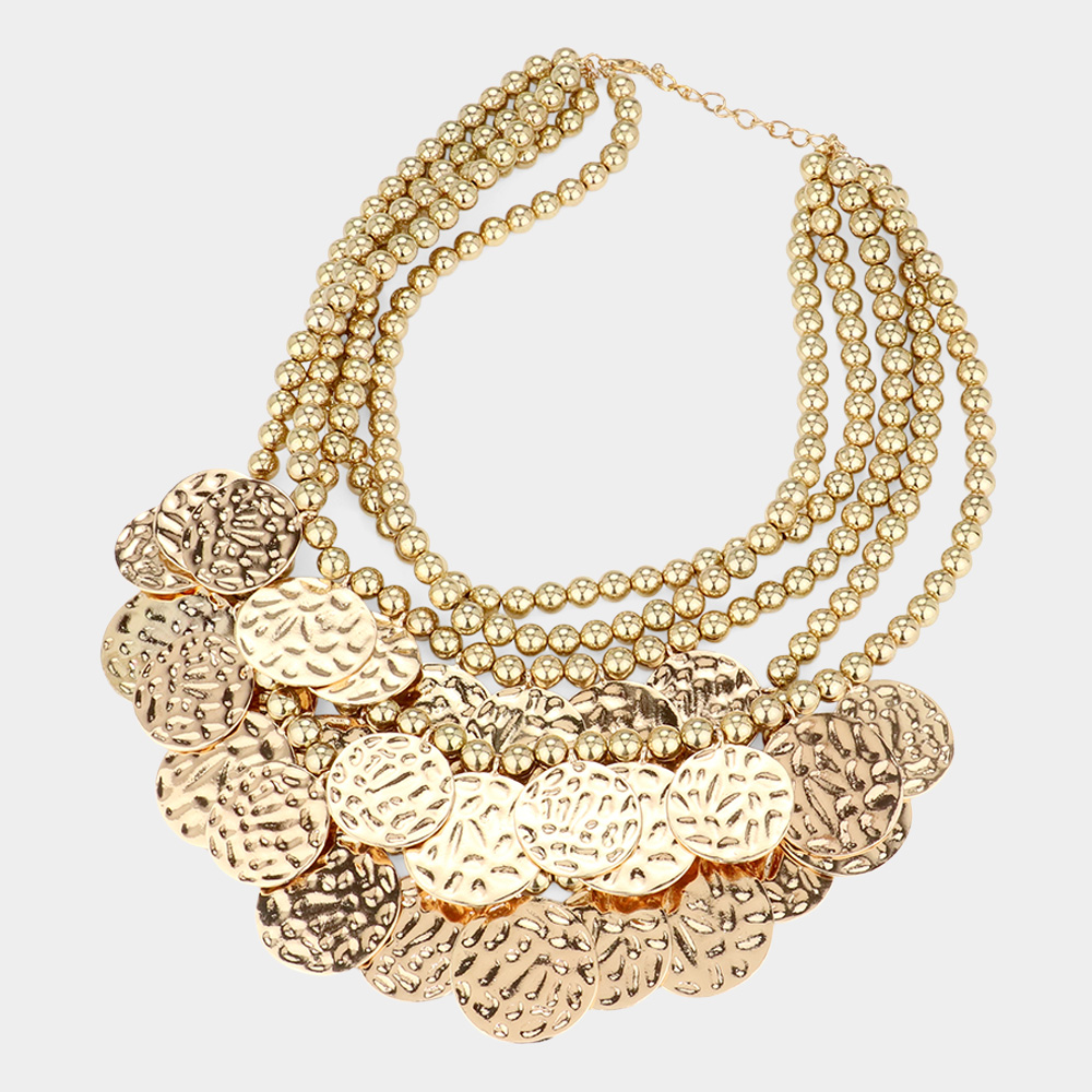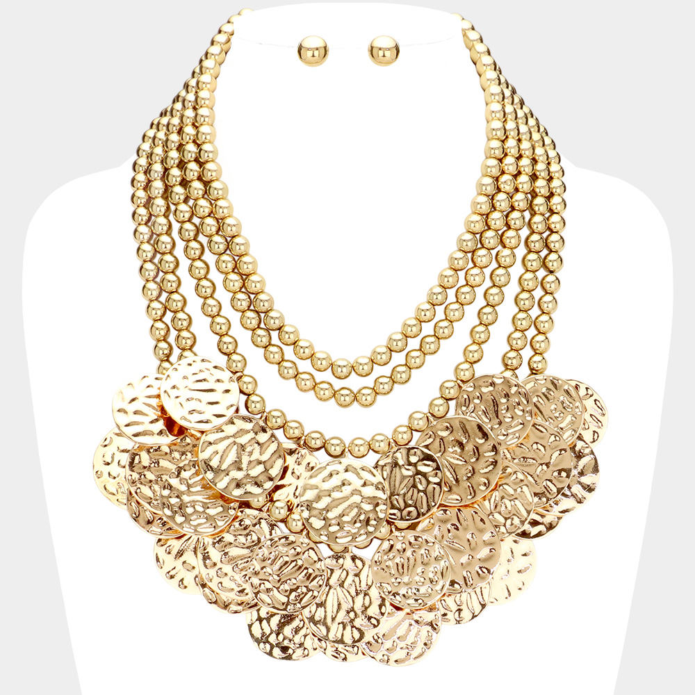 Textured Metal Disc Embellished Ball Beaded Multi Layered Statement Necklace