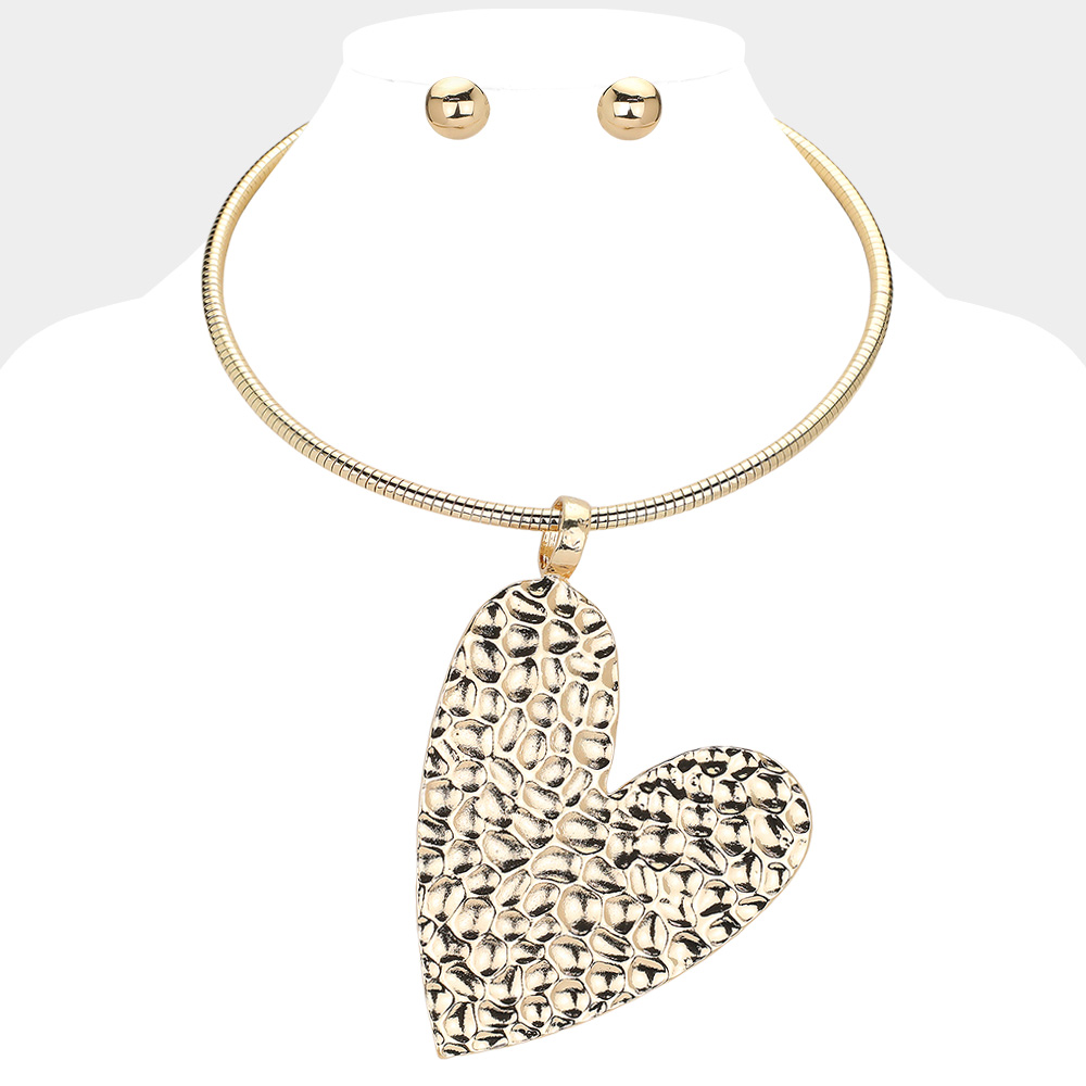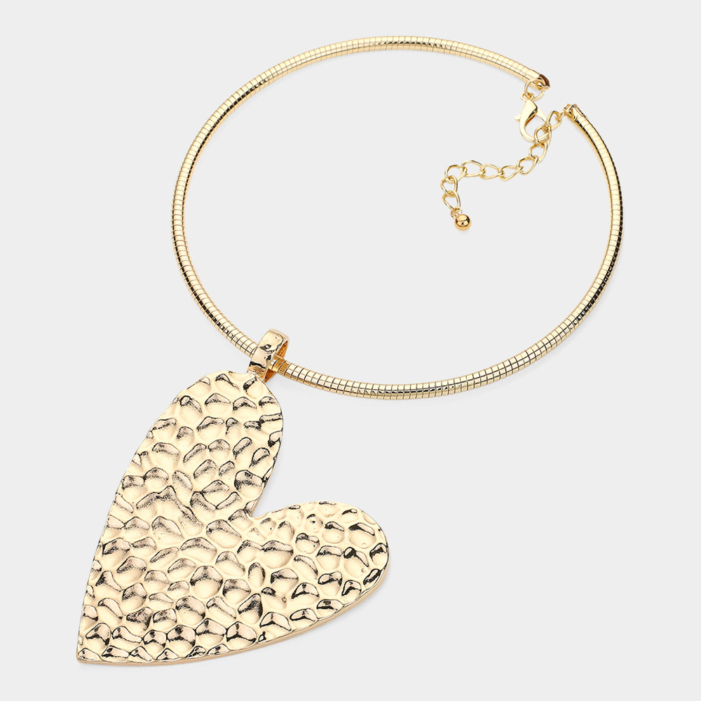 Textured Metal Heart Pendant Statement Necklace