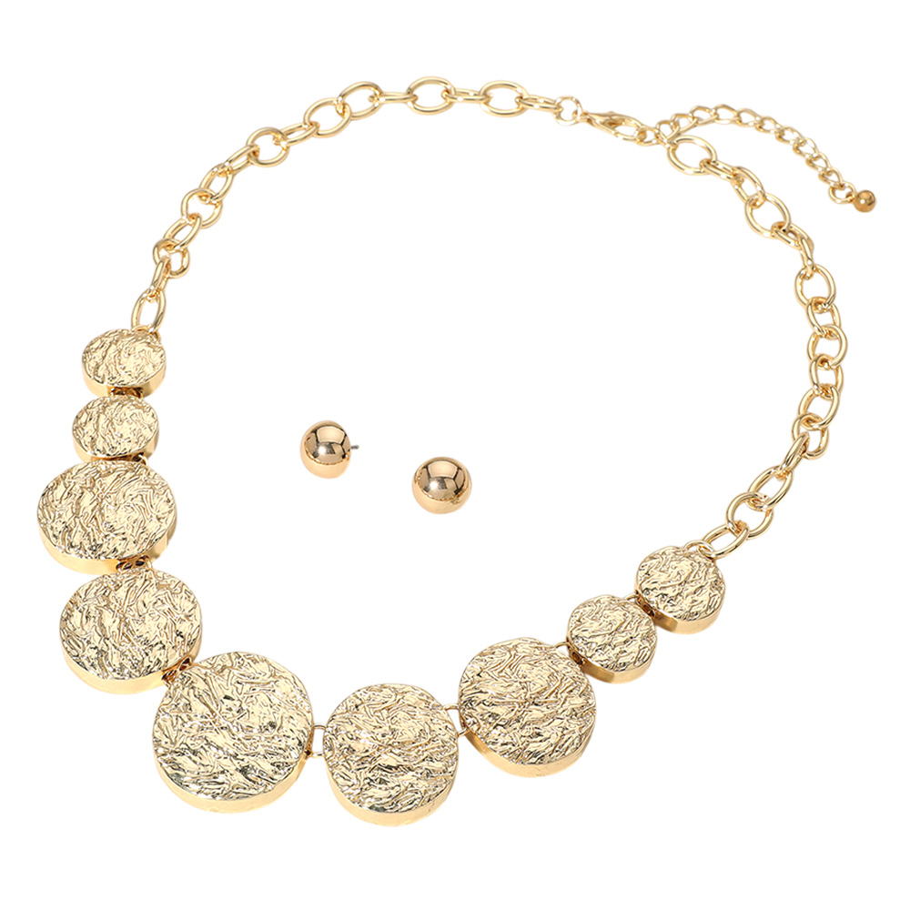 Details • Necklace Size : 23.5" + 3.25" L • Decor Size : 1.5" L • Earrings Size : 0.6" L • Chic hammered disc necklace featuring graduated circular elements and coordinating stud earrings. Ideal for adding texture and elegance to both casual and formal outfits. • Lead and Nickel Compliant