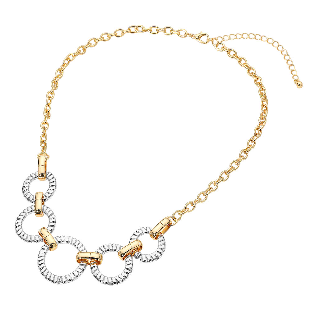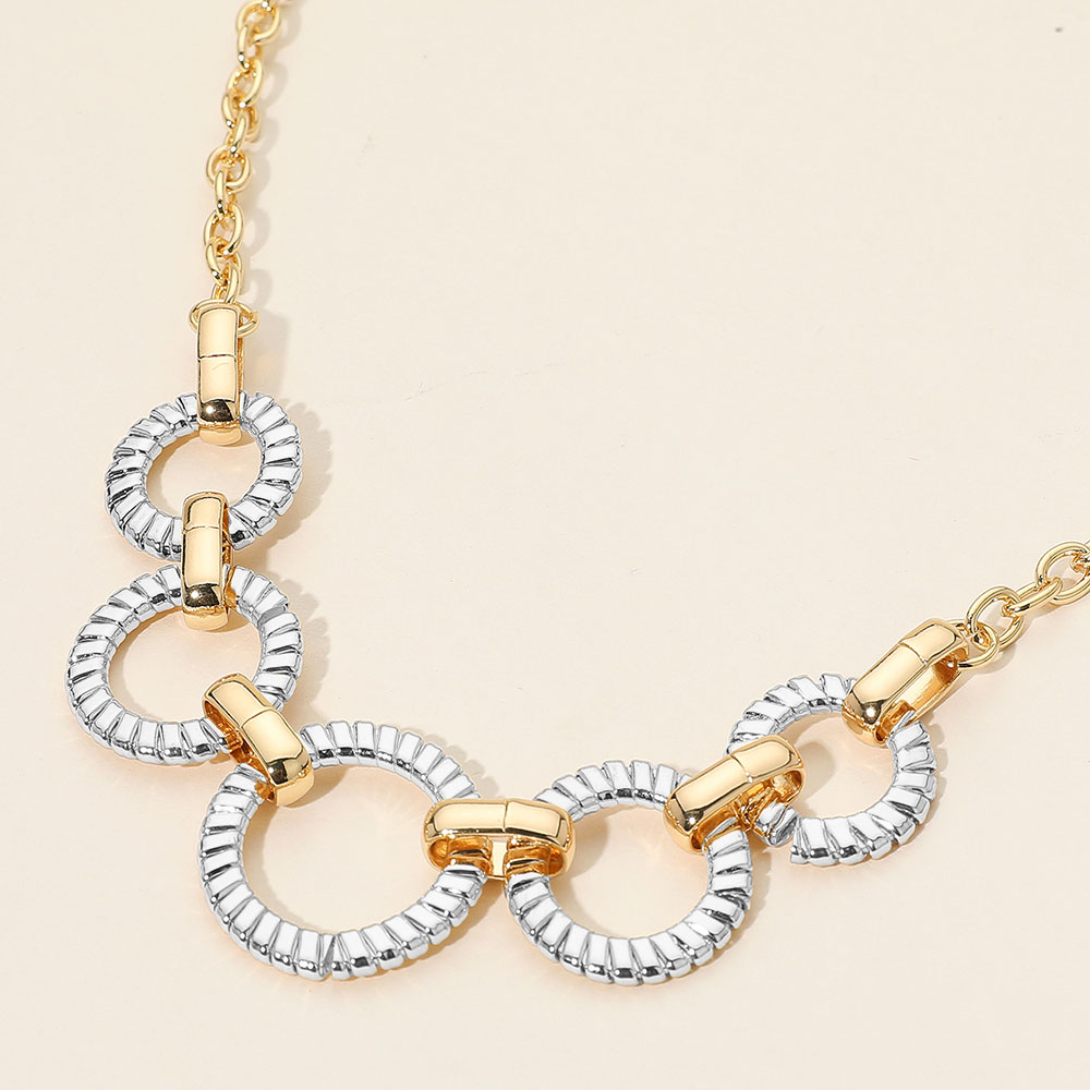 • Showcase your style with this linked circle statement necklace featuring a bold geometric design. Adjustable length for a perfect fit, ideal for enhancing casual or formal outfits with a touch of sophistication.