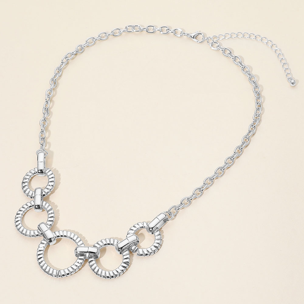 • Showcase your style with this linked circle statement necklace featuring a bold geometric design. Adjustable length for a perfect fit, ideal for enhancing casual or formal outfits with a touch of sophistication.