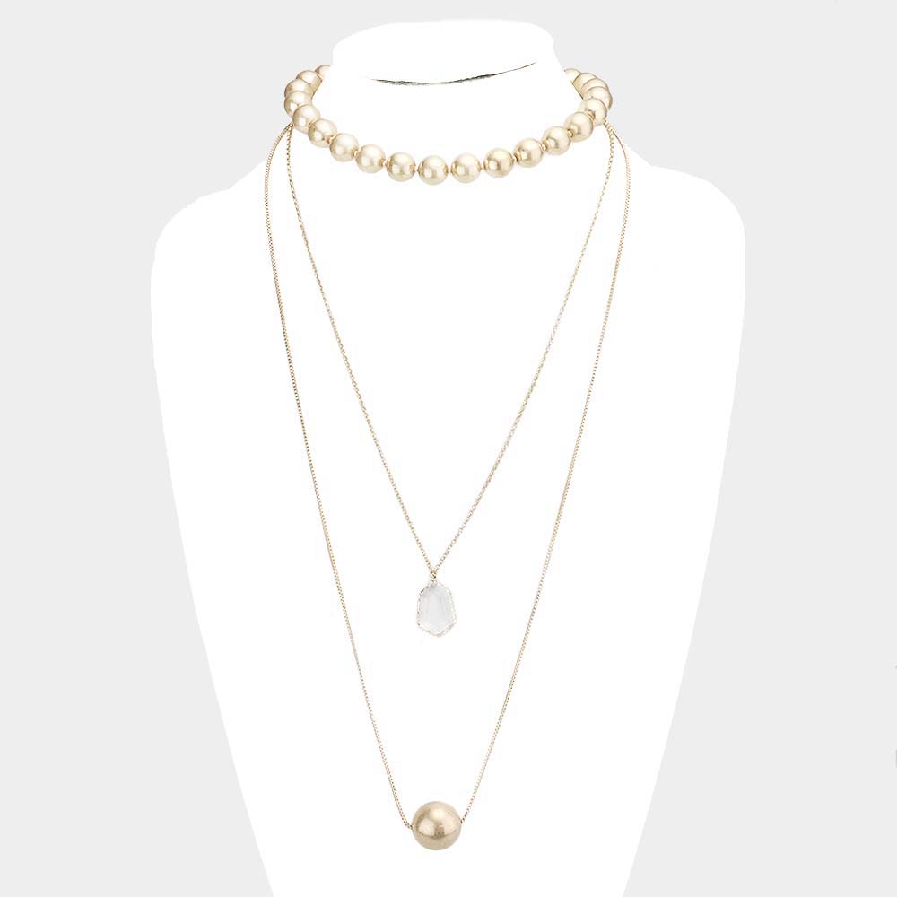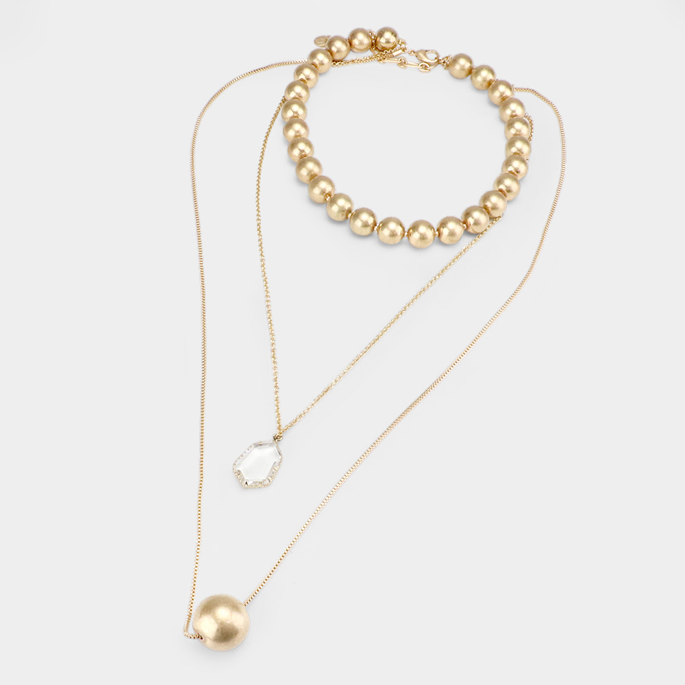 Triple Layered Clear Hexagon Metal Ball Pendant Necklace
