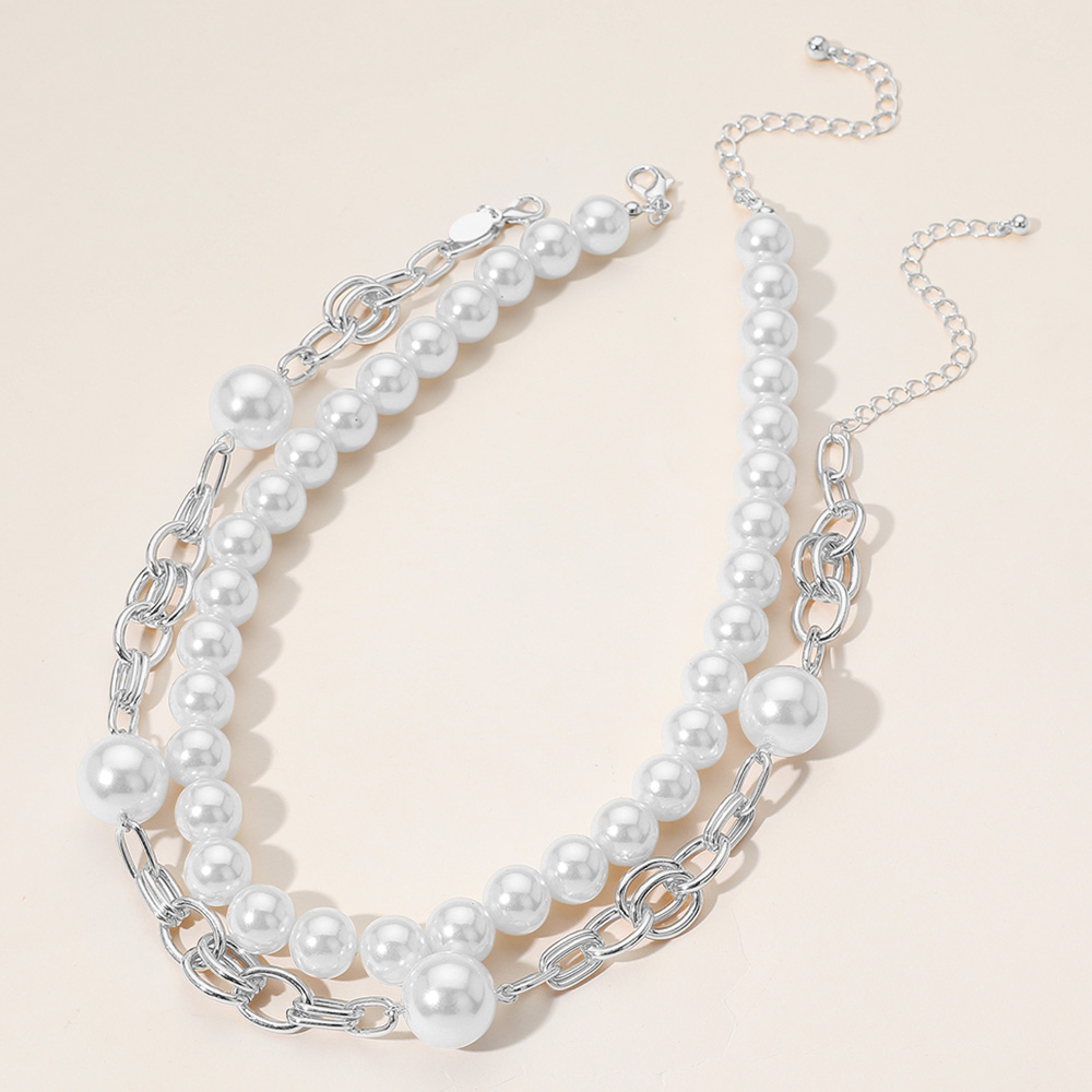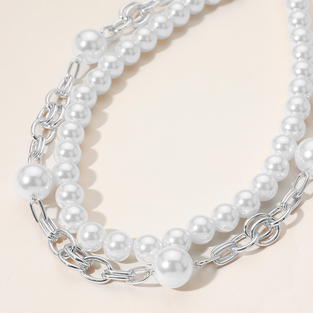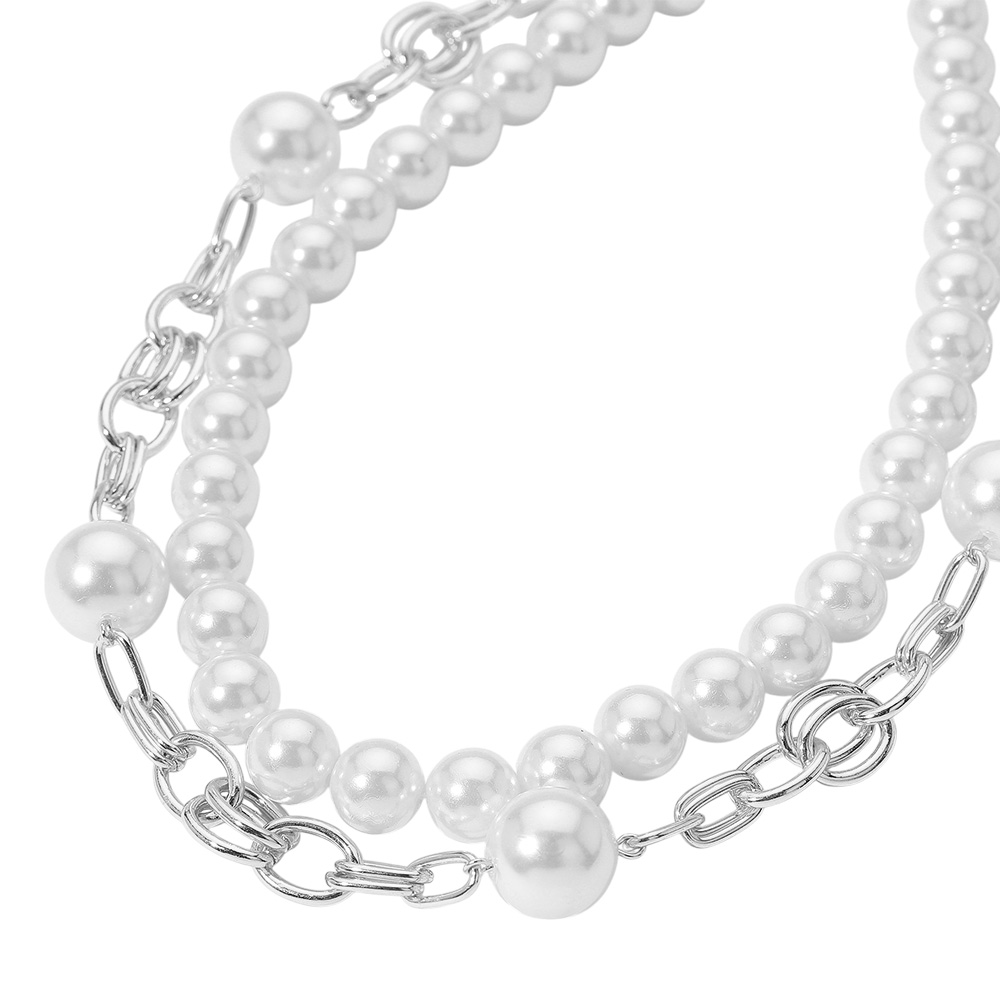 Details • Necklace 1 Size : 17" + 3" L, 0.5" L • Necklace 2 Size : 16.5" + 3.25" L, 0.6" L • Elevate your style with this layered necklace featuring lustrous faux pearls and sleek chain links. A perfect fusion of classic charm and modern edge, ideal for both formal and casual looks. • Lead and Nickel Compliant