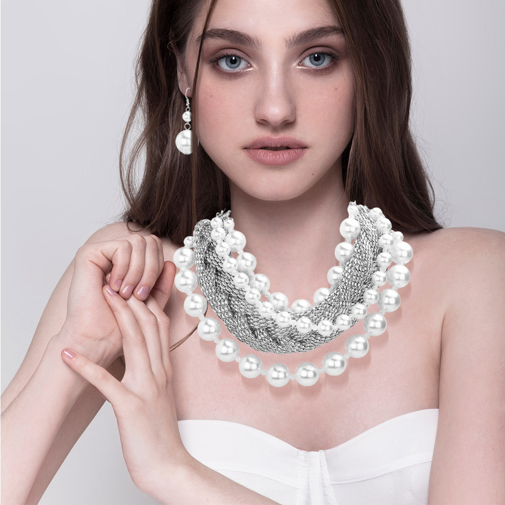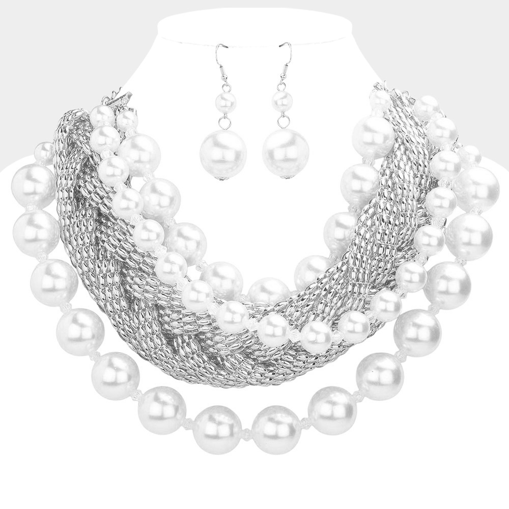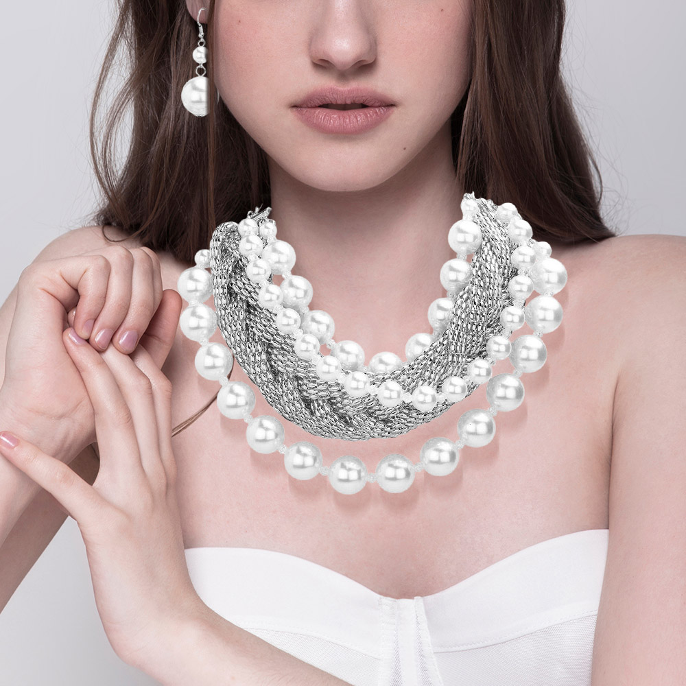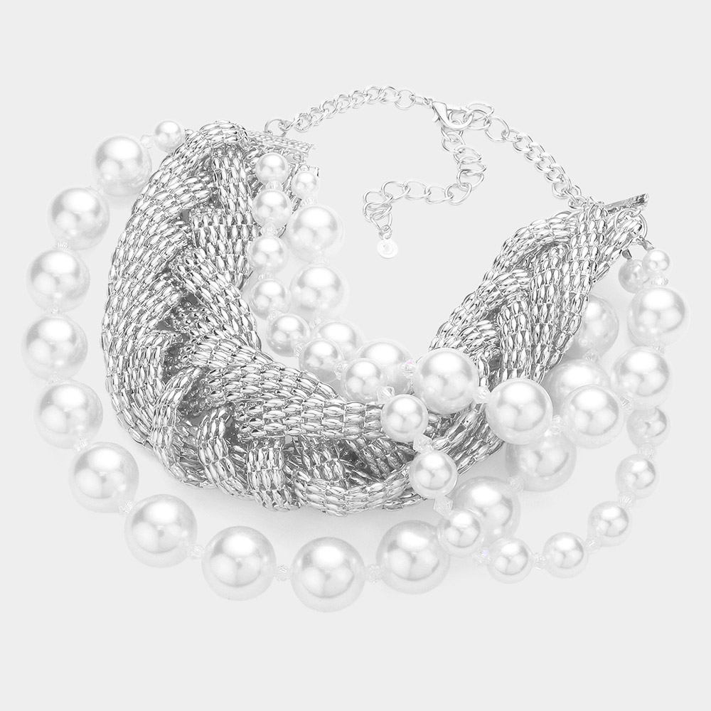 Bold Metal Braided Triple Layered Pearl Necklace