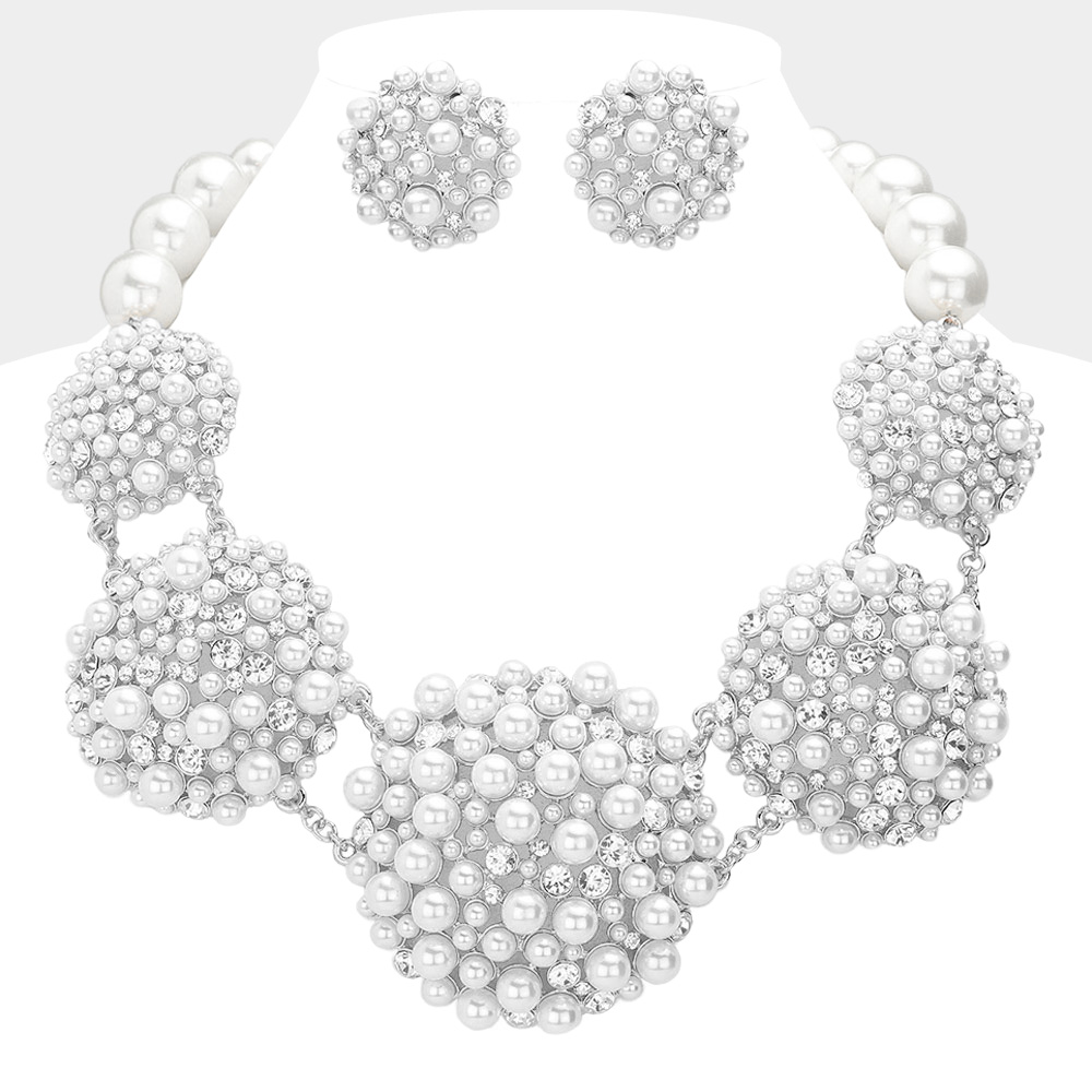Details • Necklace Size : 18" + 3" L • Decor Size : 2.5" L • Earring Size : 1.25" L • This bold cluster statement necklace and earring set features oversized beaded clusters for a dramatic and glamorous look. Perfect for weddings, formal occasions, or making an impression at any event, this set adds elegance and striking detail to your outfit with its dazzling clustered design. • Lead and Nickel Compliant