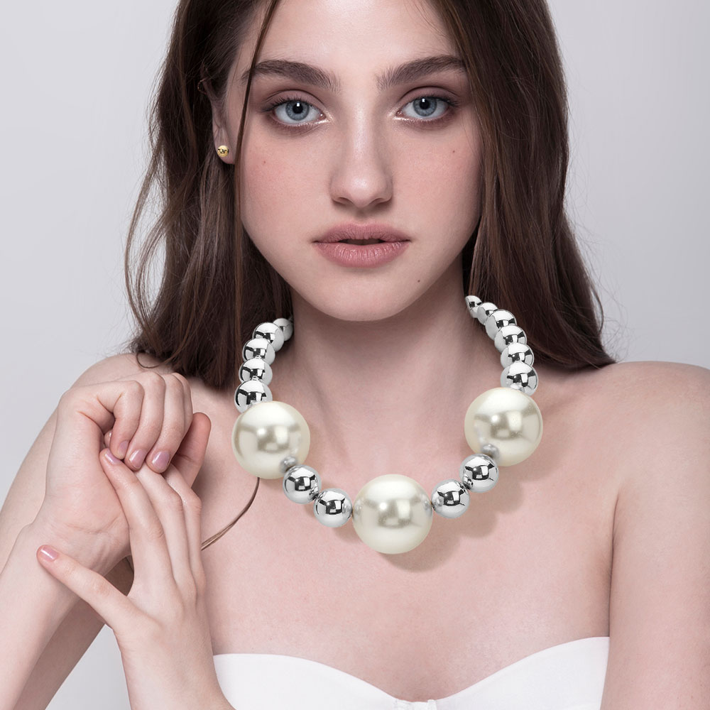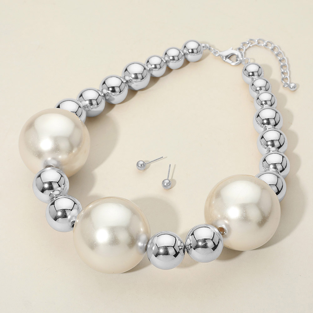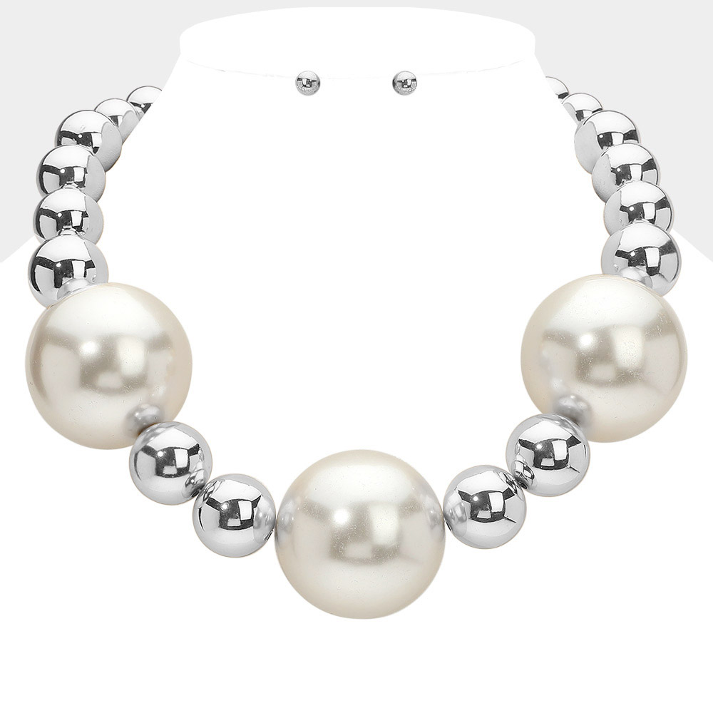 Details • Necklace Size : 18" + 3" L • Decor Size : 1.6" L • Earrings Size : 0.2" L • Bold and modern beaded necklace featuring oversized glossy spheres in an alternating design. Includes matching stud earrings for a complete, eye-catching accessory perfect for events or everyday glam. • Lead and Nickel Compliant