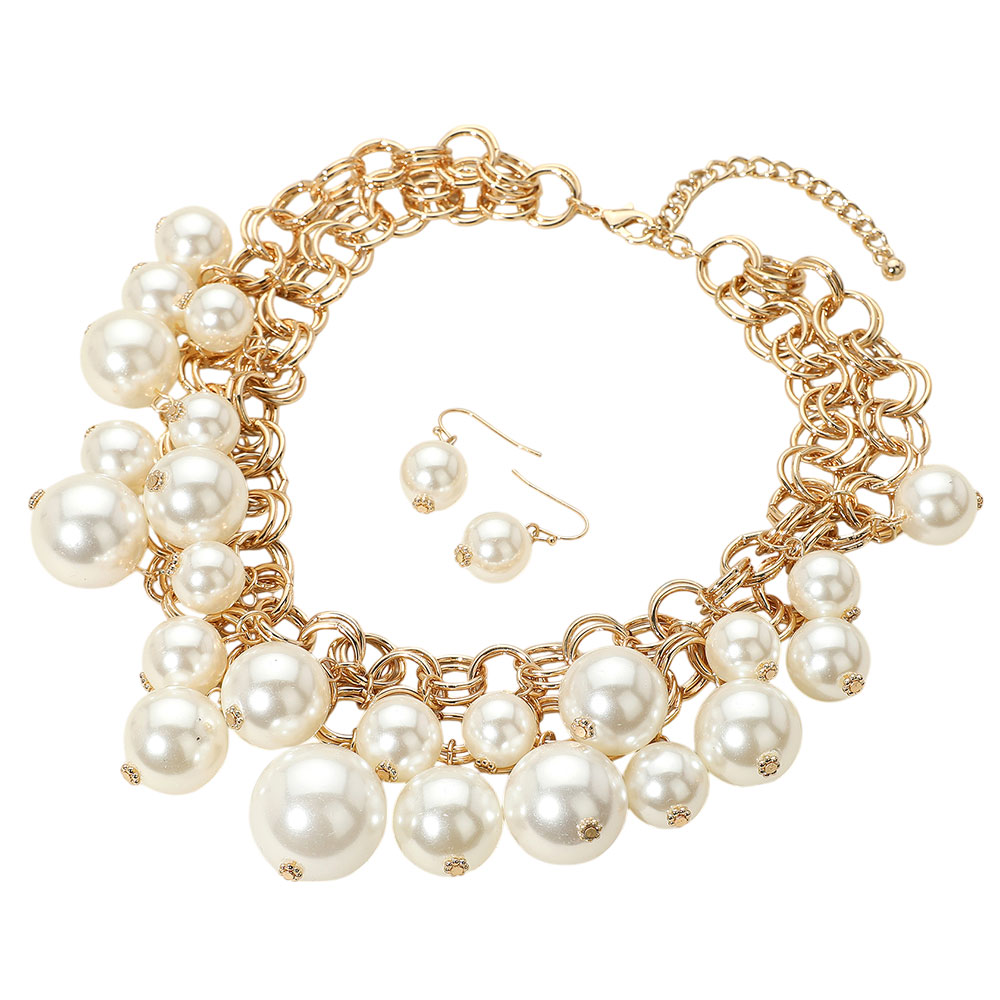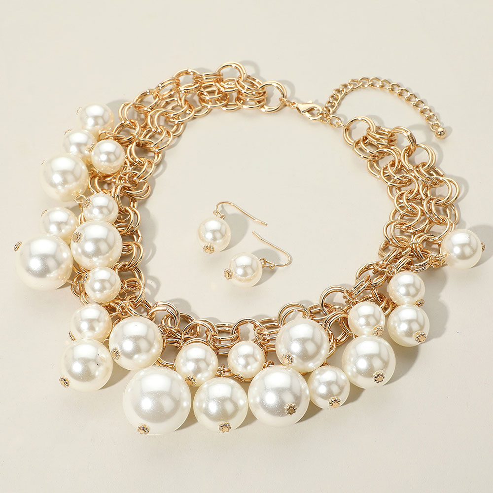 Details • Necklace Size : 16" + 3.5" L • Decor Size : 2.25" L • Earrings Size : 1.25" L • Bold statement necklace featuring clustered round beads on layered chains, paired with coordinating drop earrings. Ideal for formal events or party outfits. Elevates any look with texture and shine. • Lead and Nickel Compliant