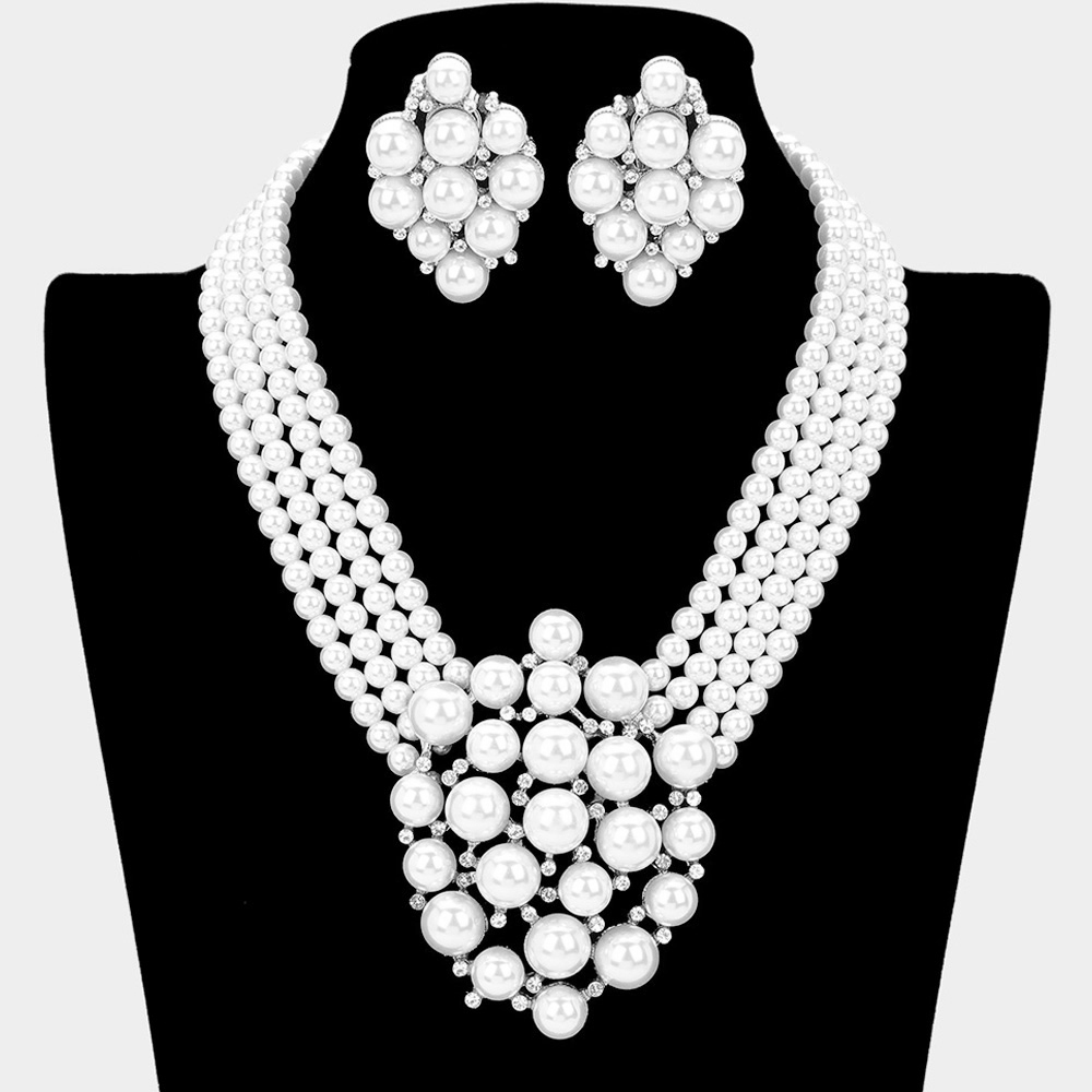 Bold Pearly Petal Floral Link Triple Pearl Strand Statement Necklace