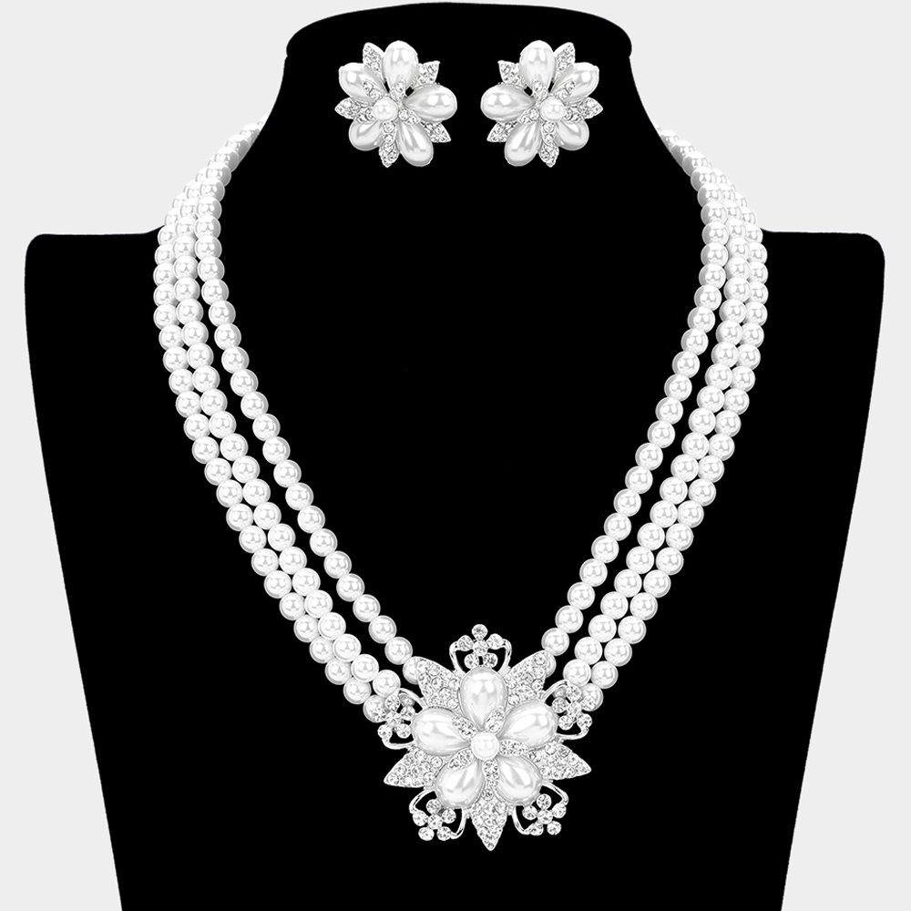 Crystal Rhinestone Paved Flower Bloom Pearl Triple Strand Necklace