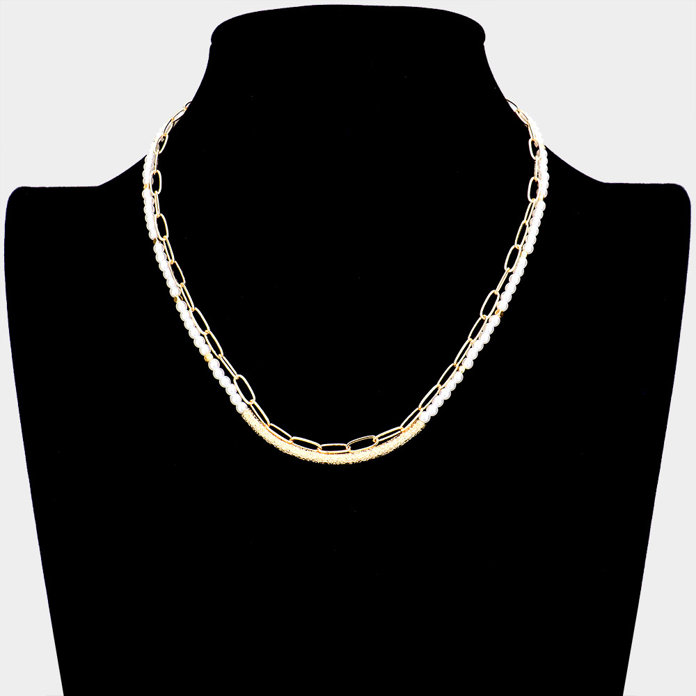 Curved Metal Tube Accented Pearl Open Oval Link Double Layered Necklace