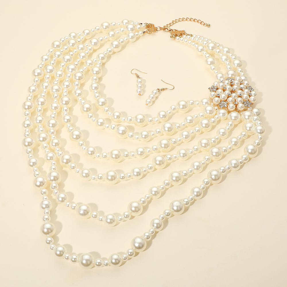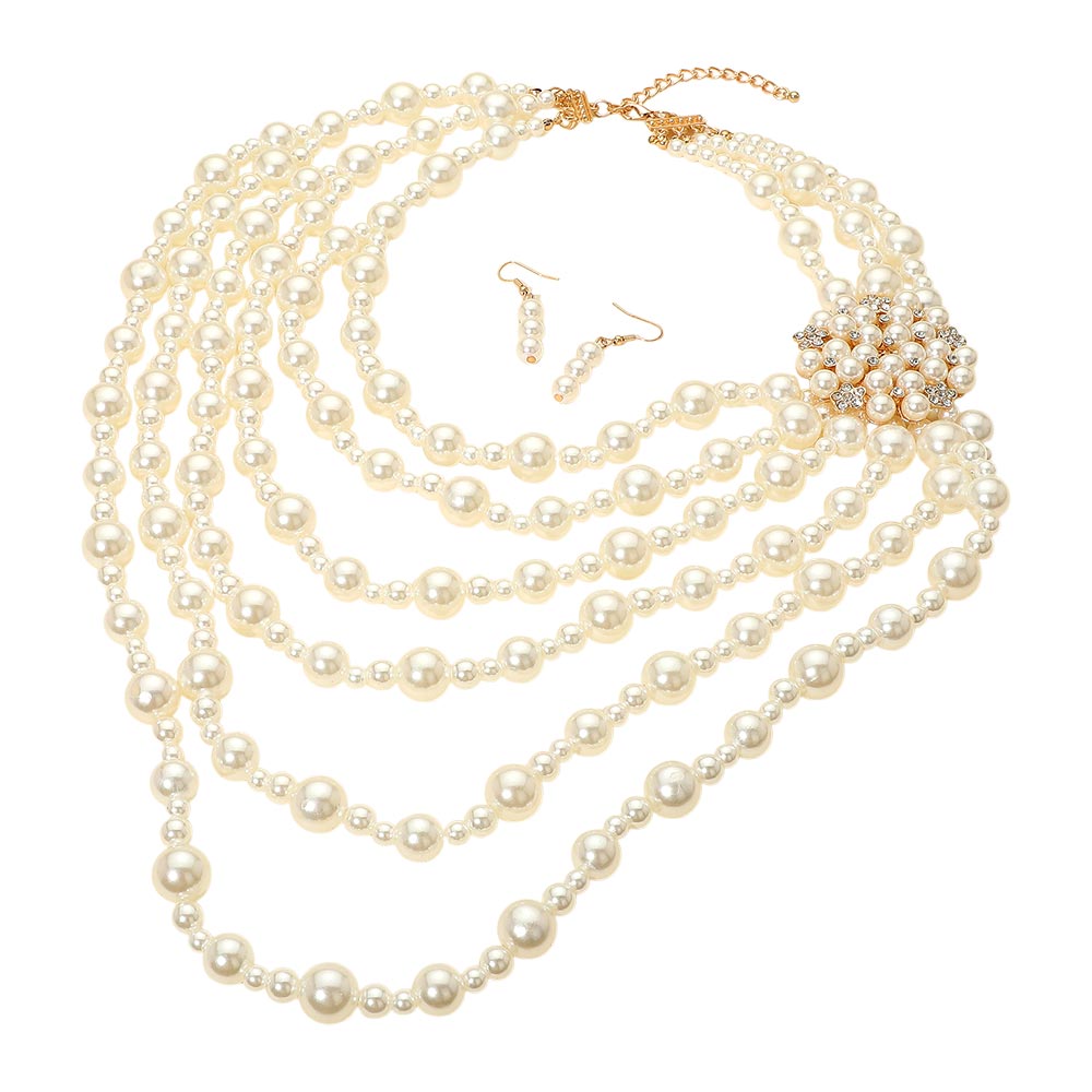 • Make a glamorous statement with this layered pearl necklace set featuring multiple strands, a floral cluster accent, and matching drop earrings. Perfect for weddings, formal events, or elegant evening wear.
