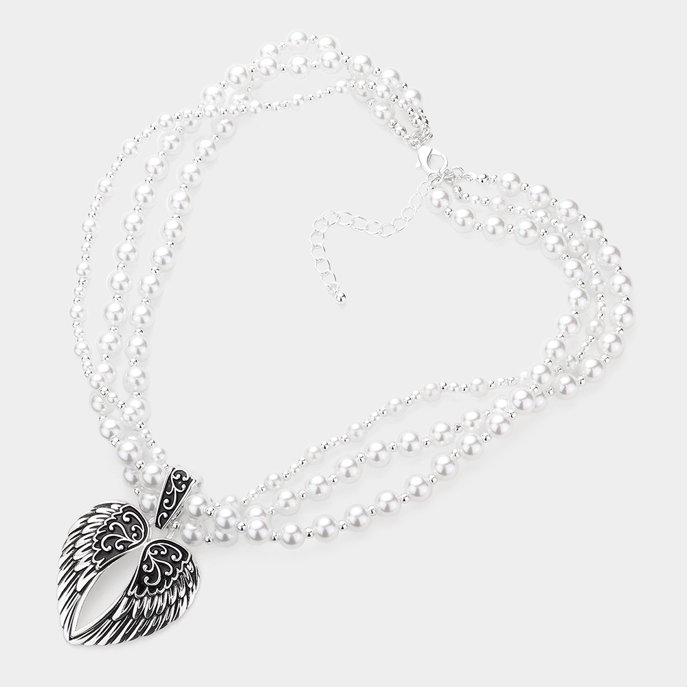 Details • Necklace Size : 18" + 3" L • Pendant Size : 1.6" X 2.3" • Earring Size : 0.3" L • Elevate your style with a layered pearl bead necklace featuring an angel wing heart pendant, symbolizing love and protection. Perfect for daily wear or special occasions. • Lead and Nickel Compliant