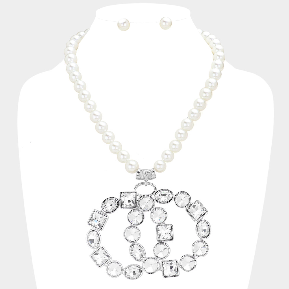 Multi Stone Embellished Double Open Circle Link Pendant Pearl Necklace