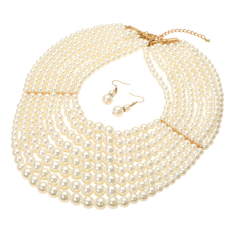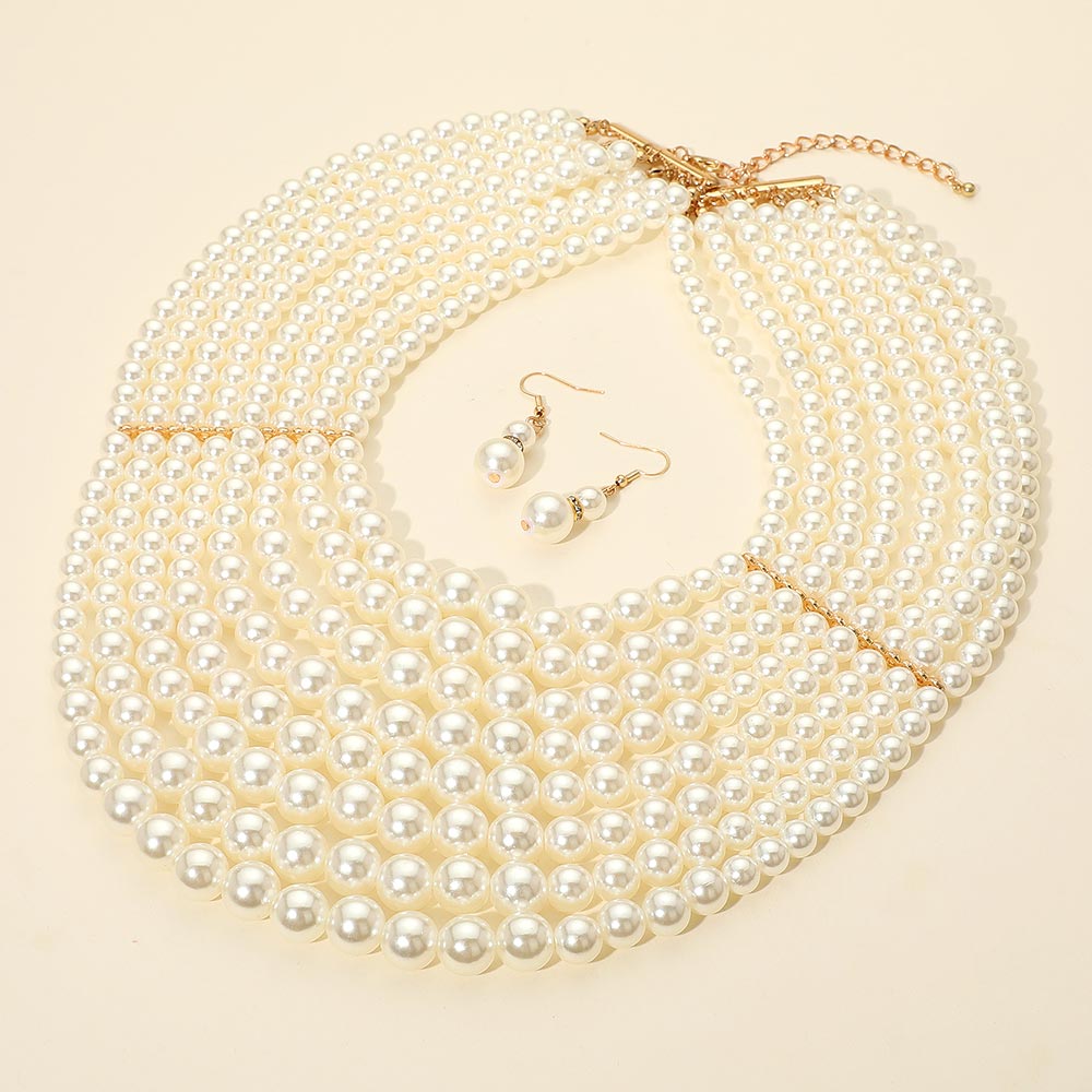 Details • Necklace Size : 16" + 3" L • Decor Size : 5" L • Earrings Size : 1.75" L • Enhance your look with this elegant multi-strand pearl necklace set featuring layered design and matching drop earrings. A timeless accessory ideal for formal occasions, weddings, or vintage-inspired style. • Lead and Nickel Compliant