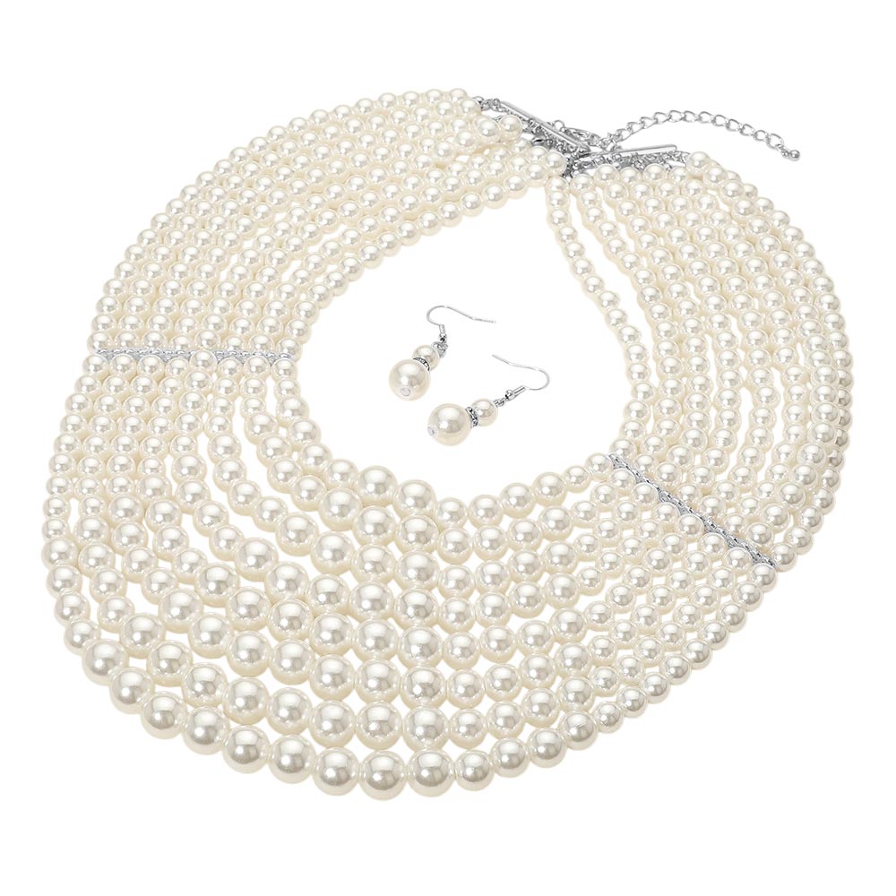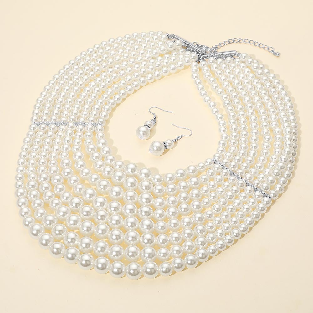 Details • Necklace Size : 16" + 3" L • Decor Size : 5" L • Earrings Size : 1.75" L • Enhance your look with this elegant multi-strand pearl necklace set featuring layered design and matching drop earrings. A timeless accessory ideal for formal occasions, weddings, or vintage-inspired style. • Lead and Nickel Compliant