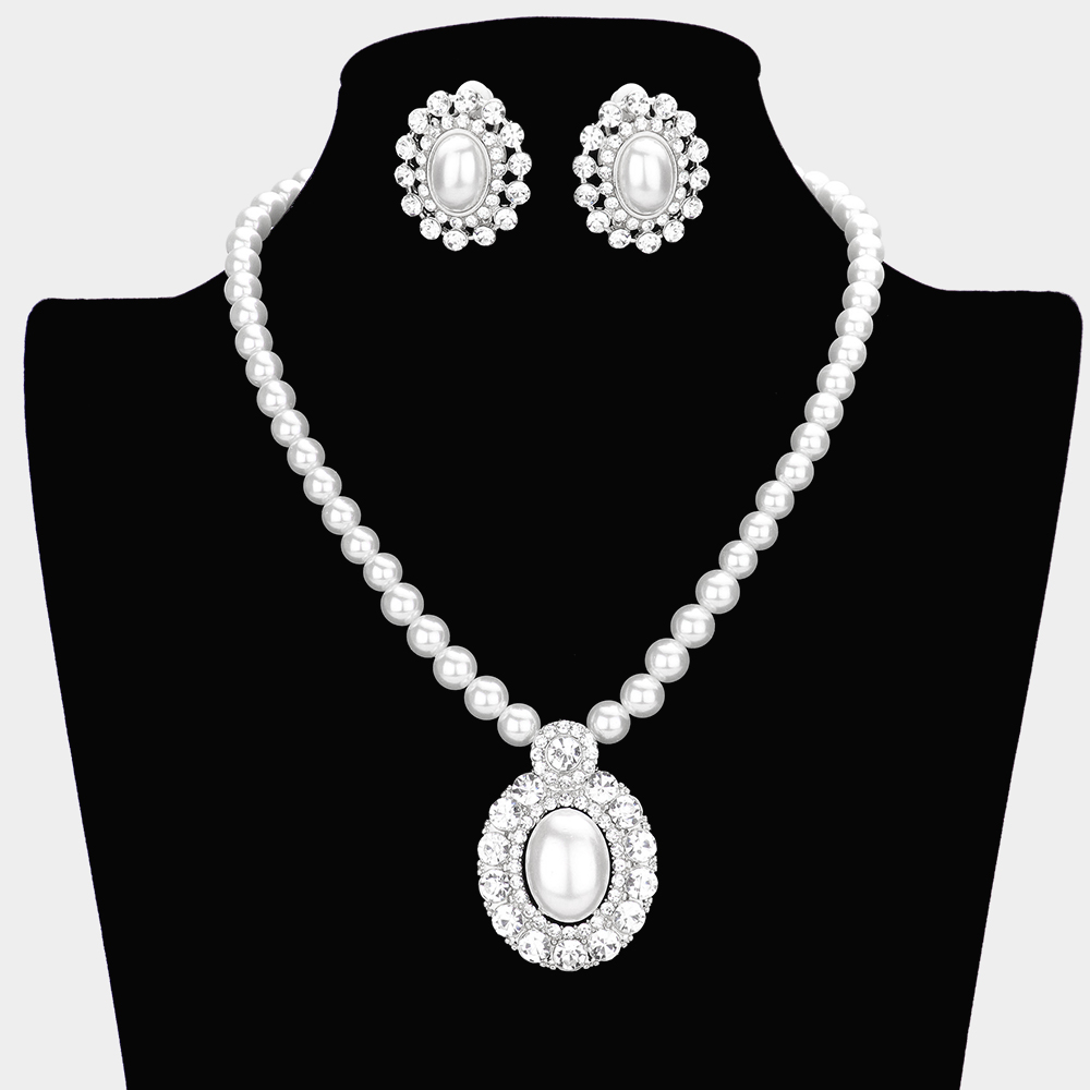 Oval Pearl Centered Bubble Stone Trimmed Pendant Necklace Clip On Earring Set