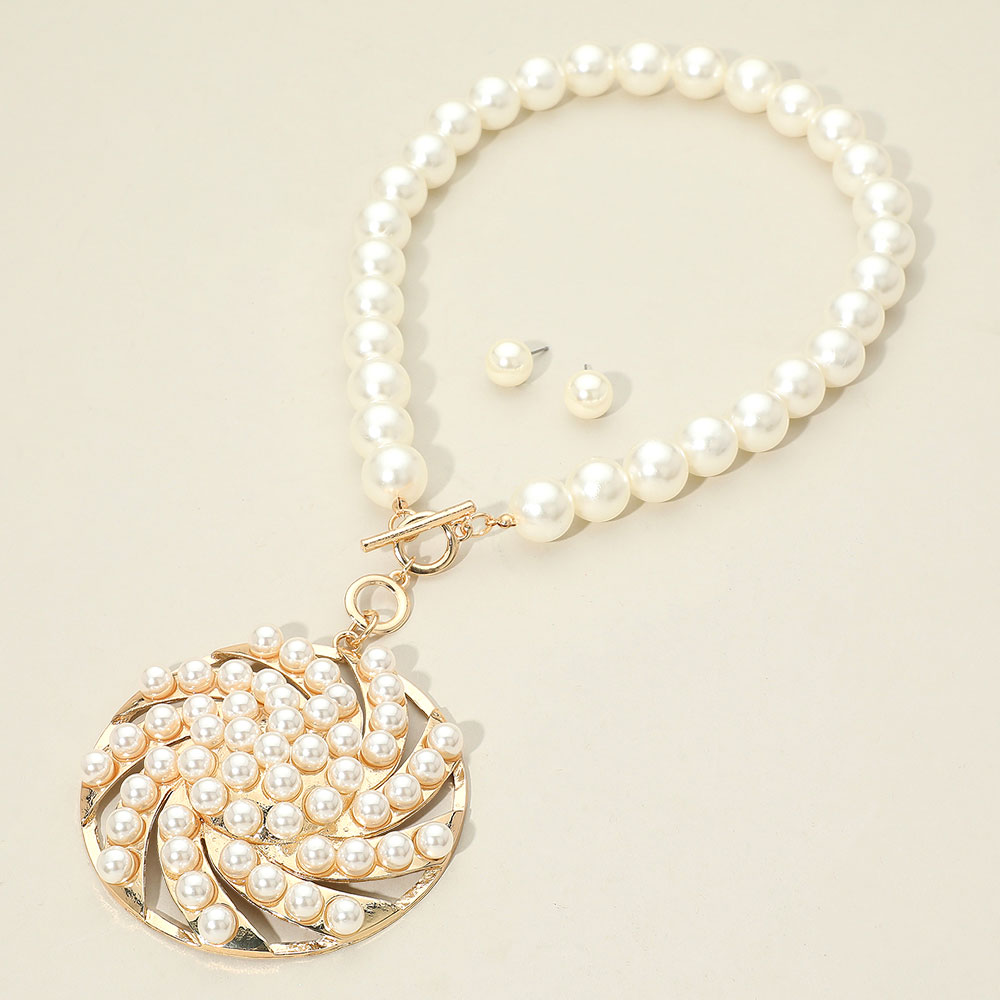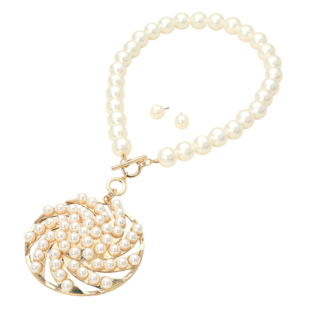Details • Necklace Size : 19" + 2" L • Pendant Size : 3.5" X 3.5" • Earrings Size : 0.4" L • Make a bold impression with this swirl pendant pearl necklace and coordinating stud earrings set. The eye-catching pendant design adds artistic flair to the timeless string of pearls, creating a refined and contemporary look perfect for formal occasions or special celebrations. • Lead and Nickel Compliant