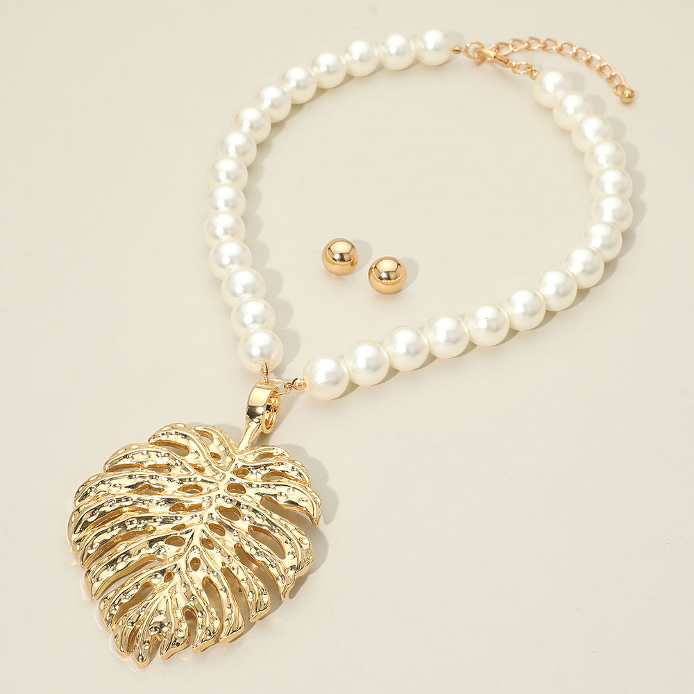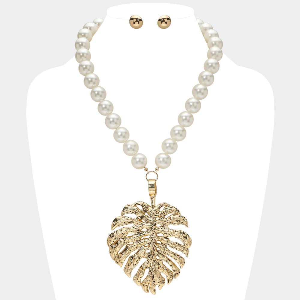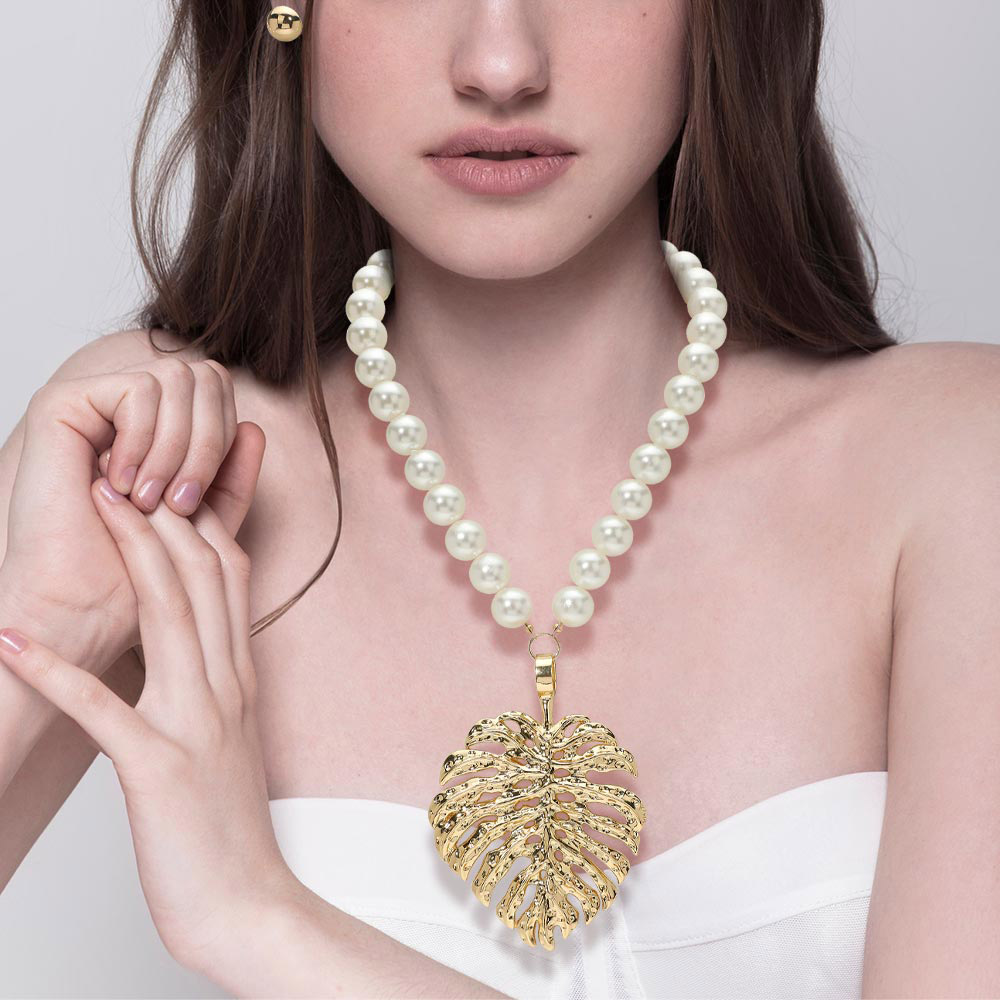 Details • Necklace Size : 21" + 3.5" L • Pendant Size : 3.2" X 4.25" • Earrings Size : 0.5" L • Elevate your style with this tropical-inspired pearl necklace featuring a bold leaf pendant and coordinating stud earrings. The nature-inspired motif and radiant finish create a statement look that blends classic charm with an exotic, modern twist—perfect for standout moments. • Lead and Nickel Compliant