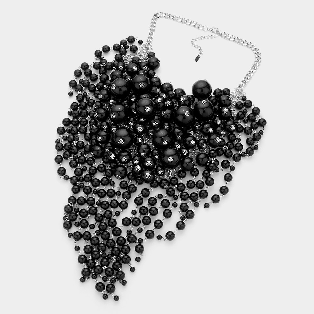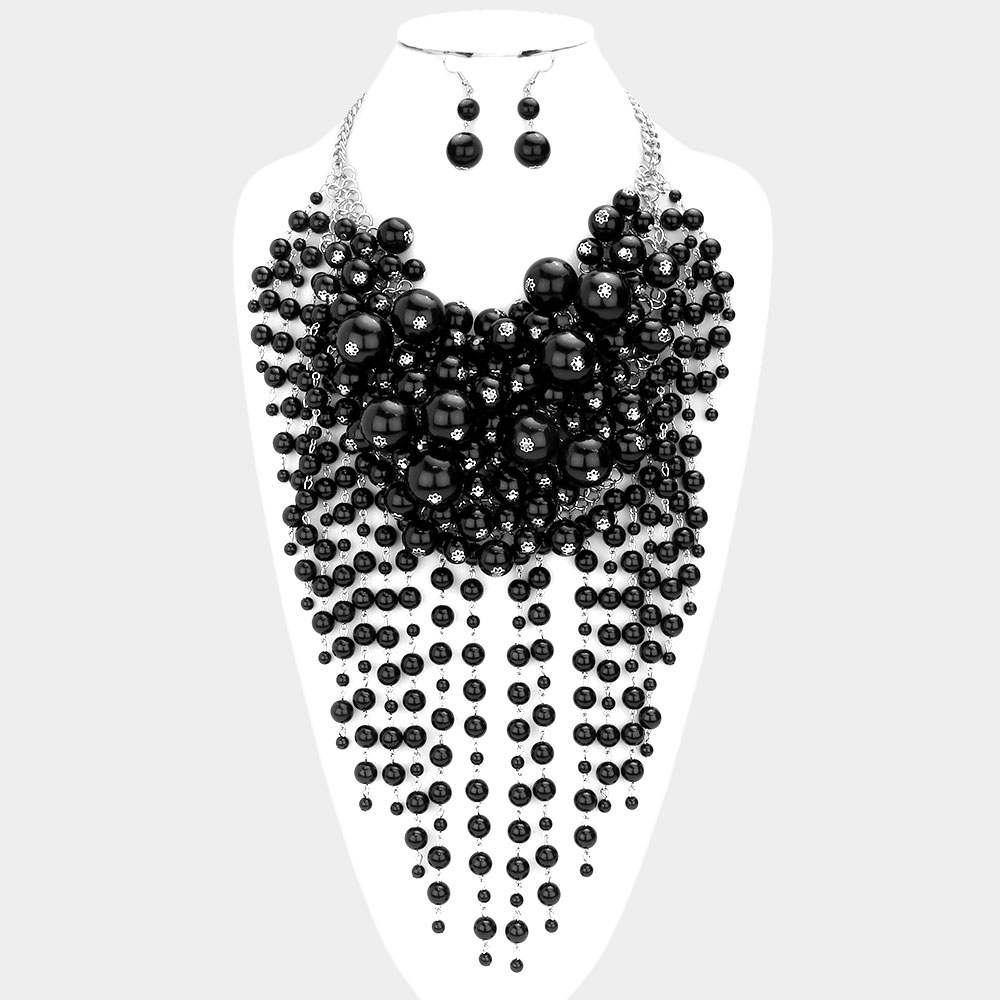 • Bold statement bib necklace with cascading beaded fringe paired with matching drop earrings. Dramatic multi-strand design adds runway-worthy impact, perfect for special events, performances, photoshoots, or standout evening looks.