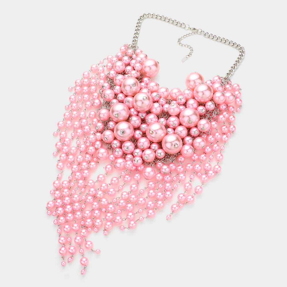 Details • Necklace Size : 20" + 3" L • Decor Size : 10" L • Earring Size : 2" L • Dramatic layered pearl necklace with cascading strands and coordinating drop earrings. Perfect for formal events, galas, or making a bold fashion statement with luxurious elegance and modern flair. • Lead and Nickel Compliant