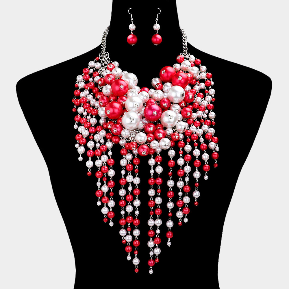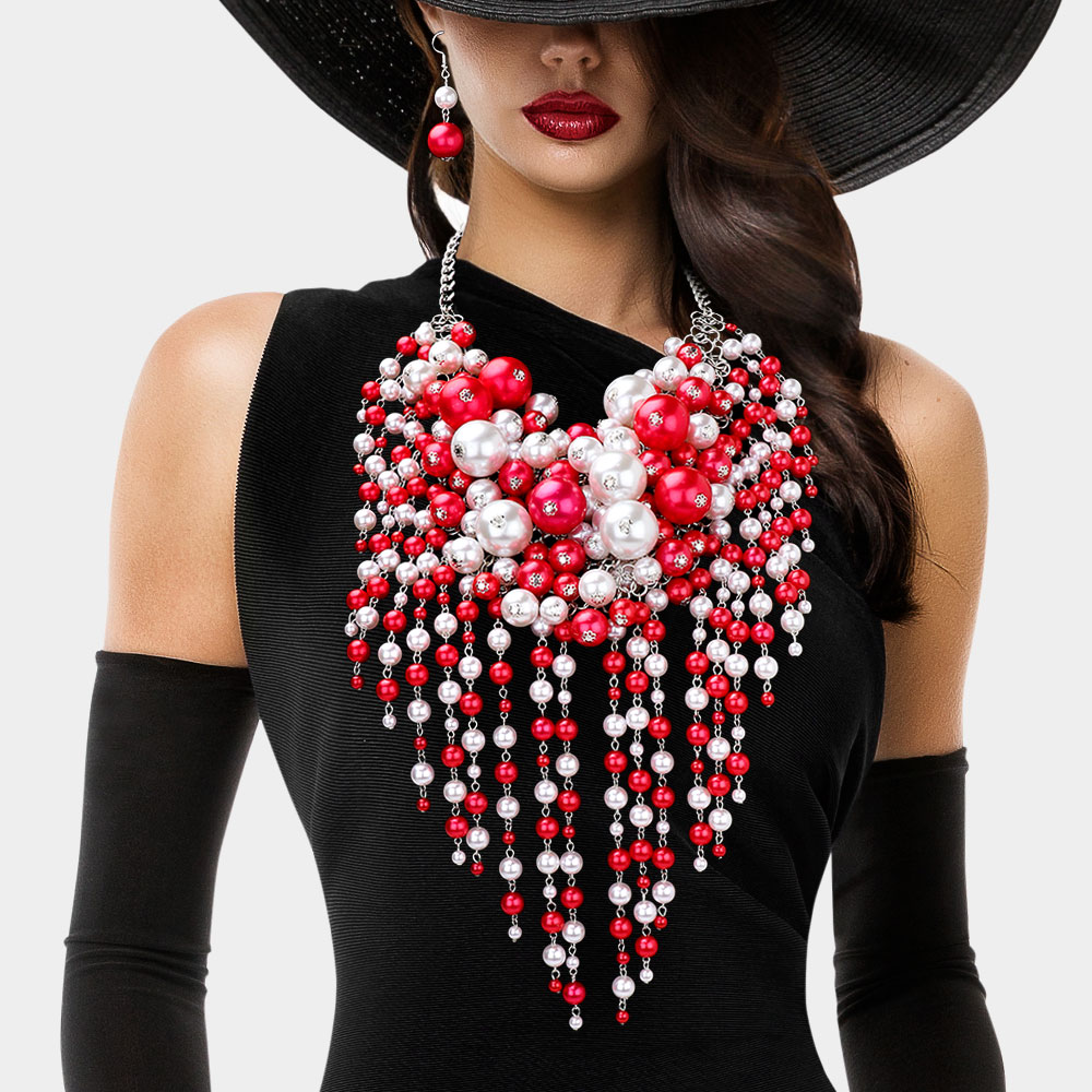 Details • Necklace Size : 20" + 3" L • Decor Size : 10" L • Earring Size : 2" L • Dramatic layered pearl necklace with cascading strands and coordinating drop earrings. Perfect for formal events, galas, or making a bold fashion statement with luxurious elegance and modern flair. • Lead and Nickel Compliant