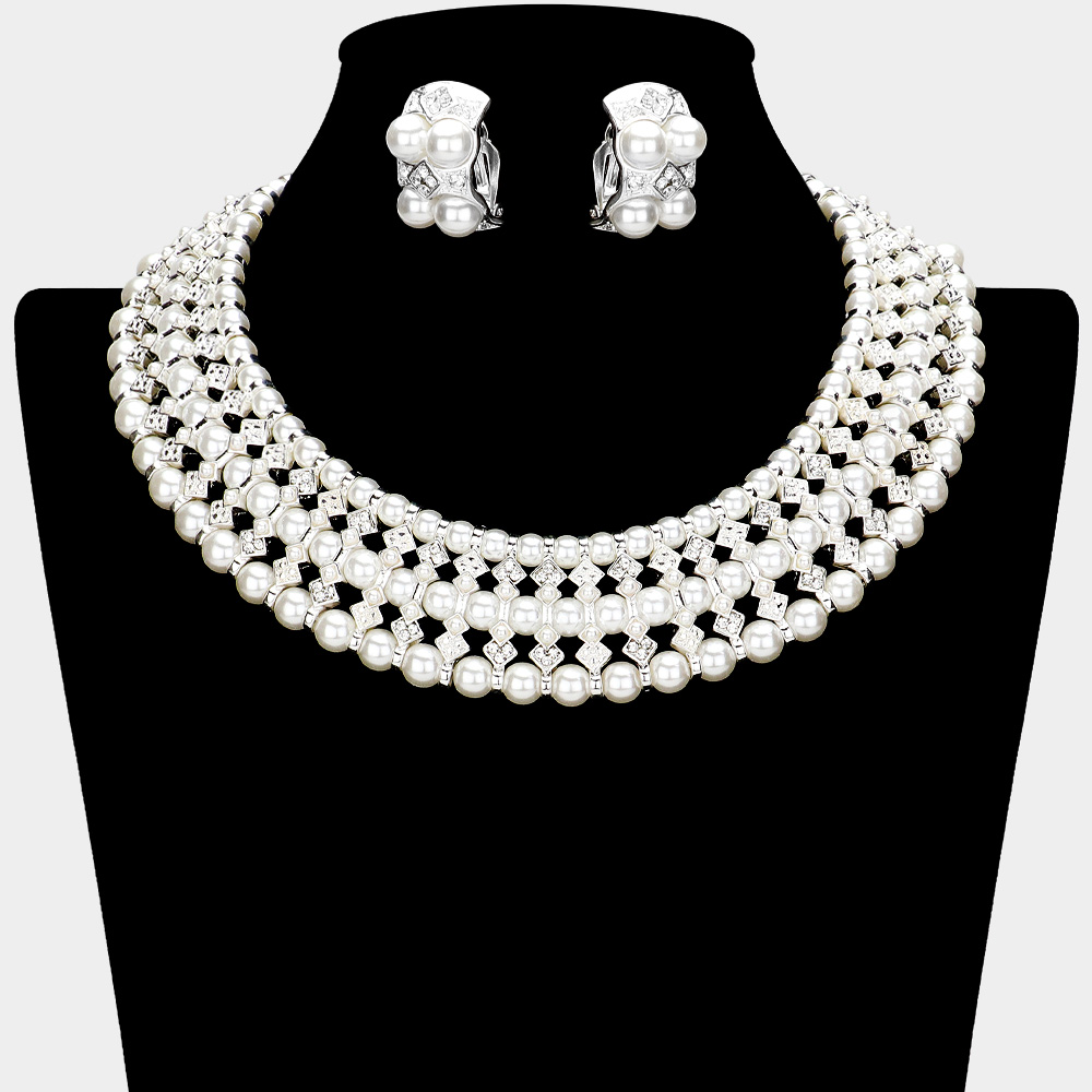 Pearl Crystal Rhinestone Collar Necklace & Clip Earring Set