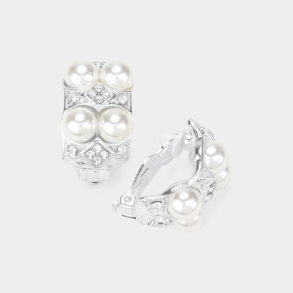 Rectangle Crystal Pearl Clip On Earrings