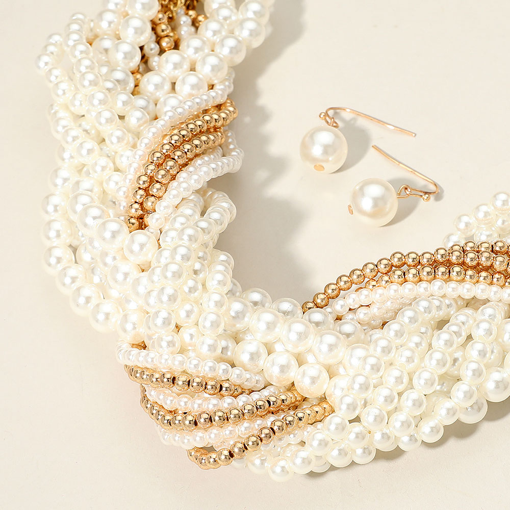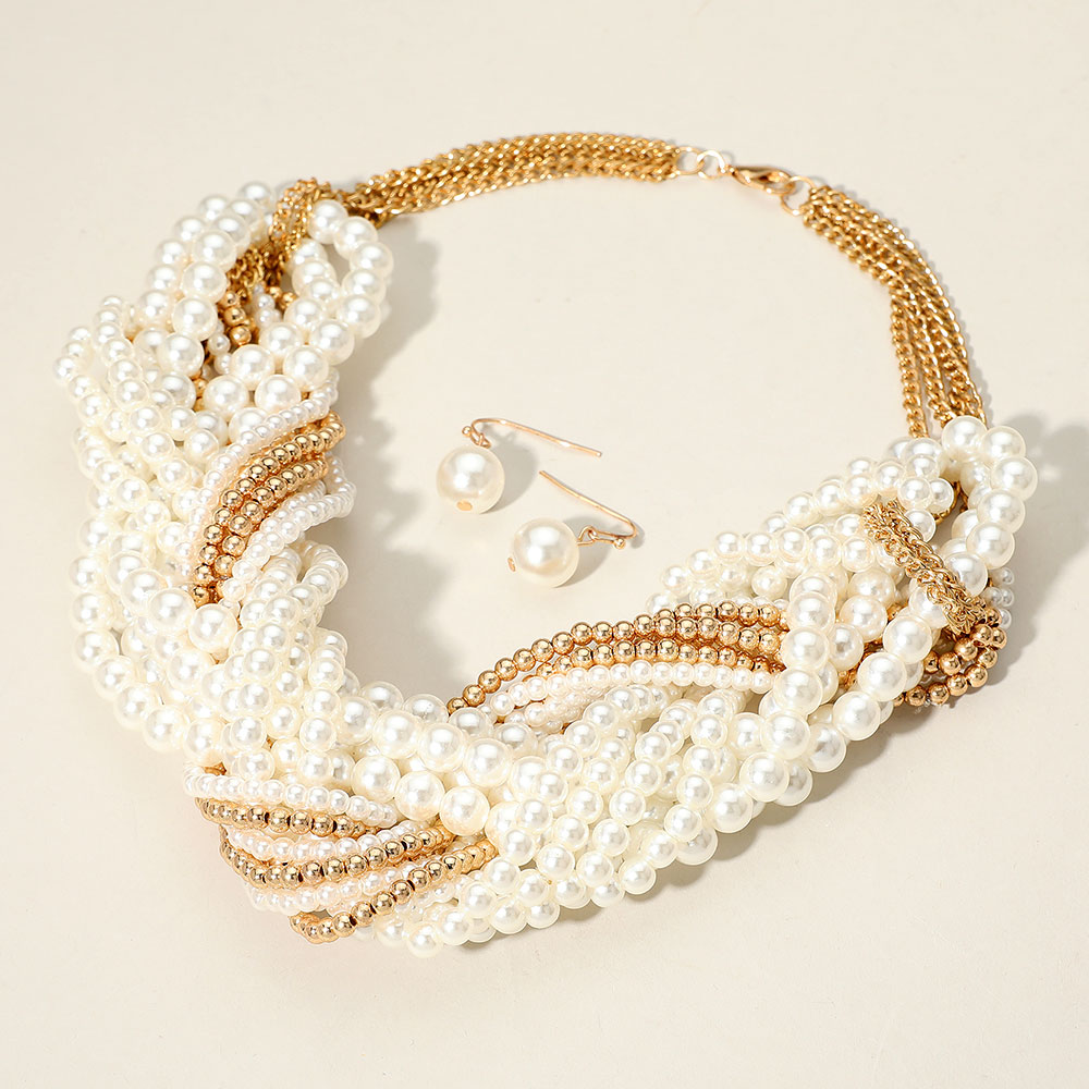 Details • Necklace Size : 18" L • Decor Size : 2" L • Earrings Size : 1" L • Make a bold impression with this intricately braided necklace set, featuring intertwined pearl and metallic beads. Includes matching earrings, perfect for upscale events or adding glam to everyday style. • Lead and Nickel Compliant