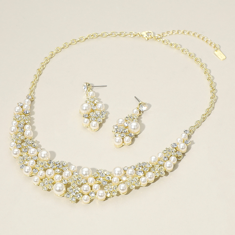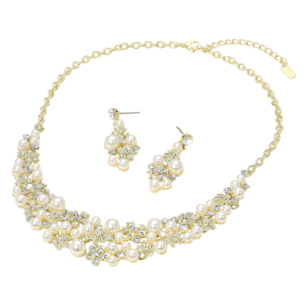 Details • Necklace Size : 18" + 3" L • Decor Size : 1.2" L • Earrings Size : 1.75" L • Dazzle with this sophisticated necklace set featuring clusters of pearls and sparkling accents. Complete with matching earrings, this statement set is ideal for weddings, galas, or timeless evening elegance. • Lead and Nickel Compliant
