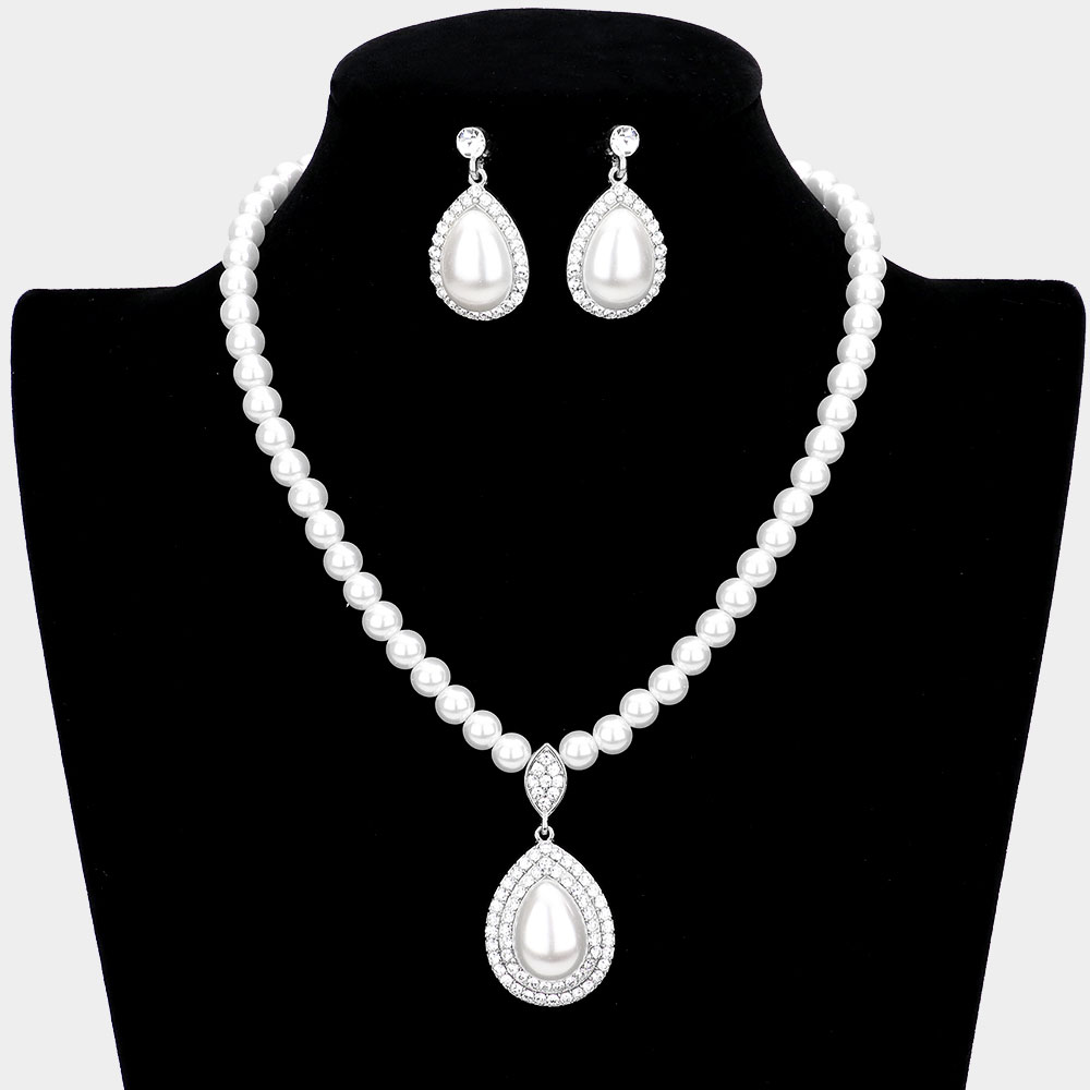 Rhinestone Trimmed Teardrop Pearl Pendant Necklace